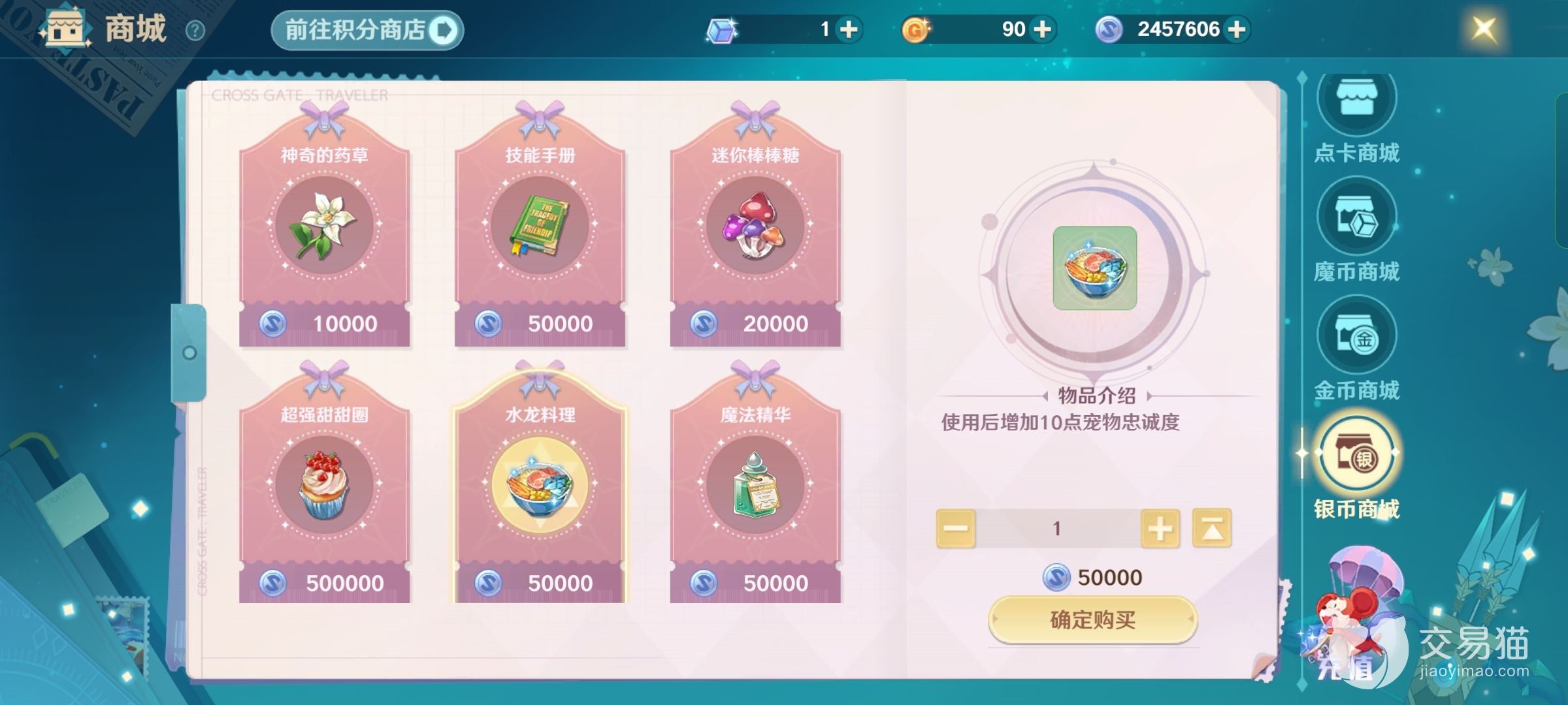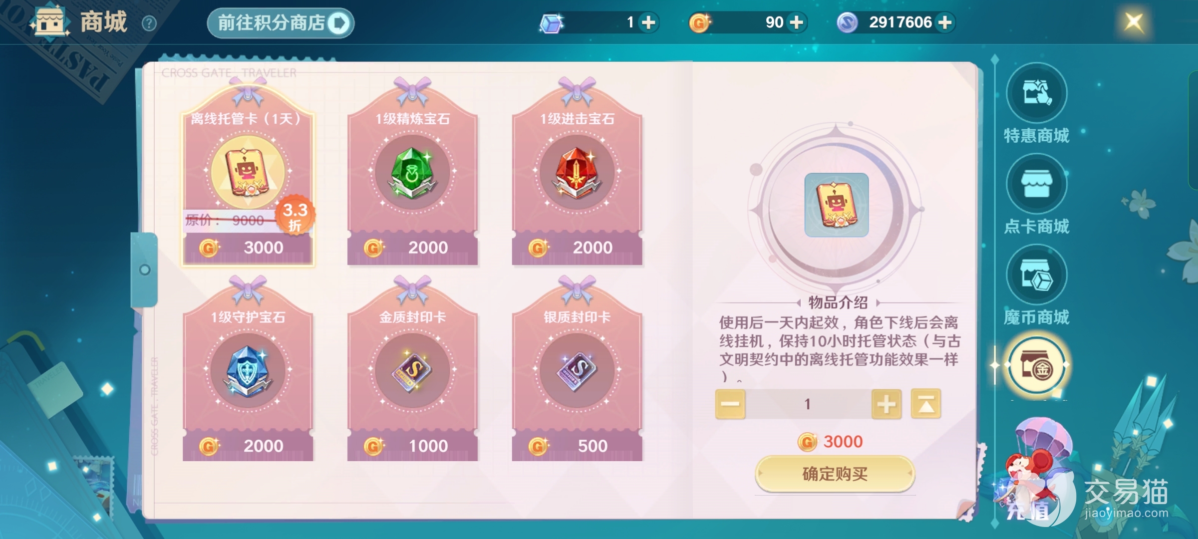 首先要知道的就是游戏当中的金币了,不是氪金的货币但是却非常的重要,玩家可以打开商城看到金币的商城里面看到托管卡和封印卡,这两个一个是离线加经验,一个是抓优质宠物必备,金币参加活动是可以赚到,当然也可以一比三千的兑换,除了商城还有拍卖行里面的极品物品也是可以自由买卖的。