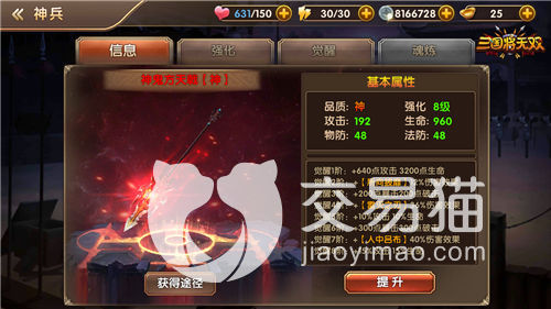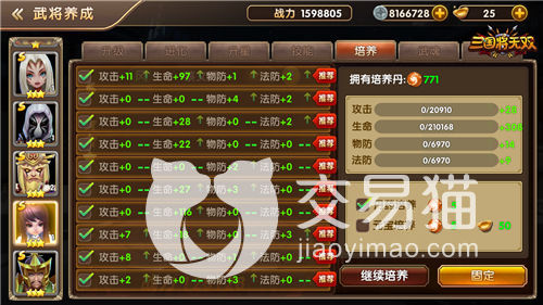 潜能则是通过培养丹来给角色四维属性带来随机涨幅,也就是洗属性,可以选择保留优秀的属性而略过不满意的属性。魂之力是通过战场中获取的武魂石来大幅提升属性,注入石头的时候偶尔灵光一现会直接提升武魂等级。最后是神兵,也可以理解为专武可以给武将带来极大的提升。