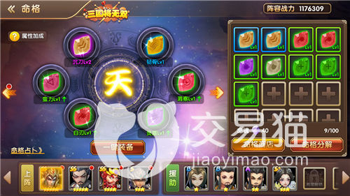 然后是武将养成,也是这个游戏中最重要的。游戏包含命格、潜能、魂之力、神兵等丰富养成内容。命格又分为天地人三层,每层有6个槽位可以通过放入宝玉来获得属性加成。