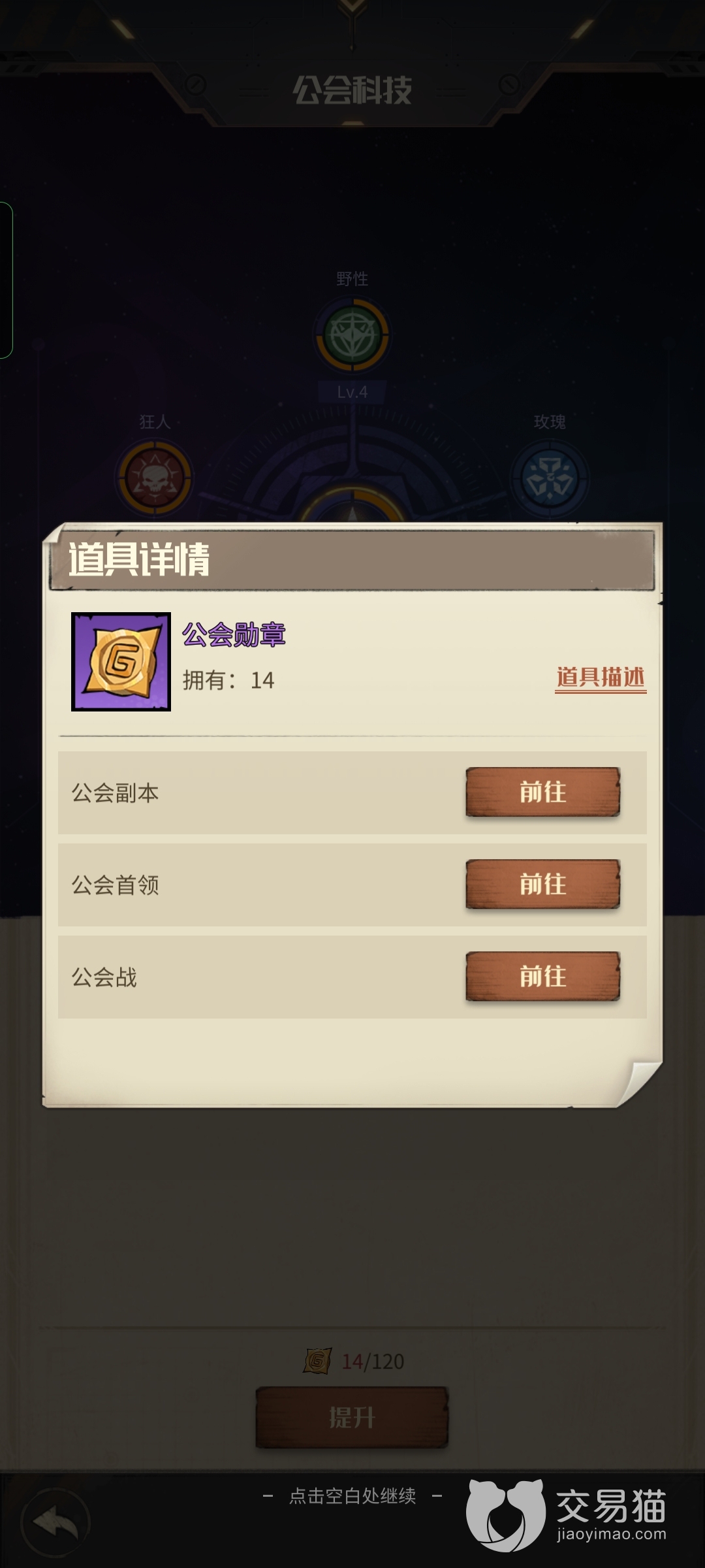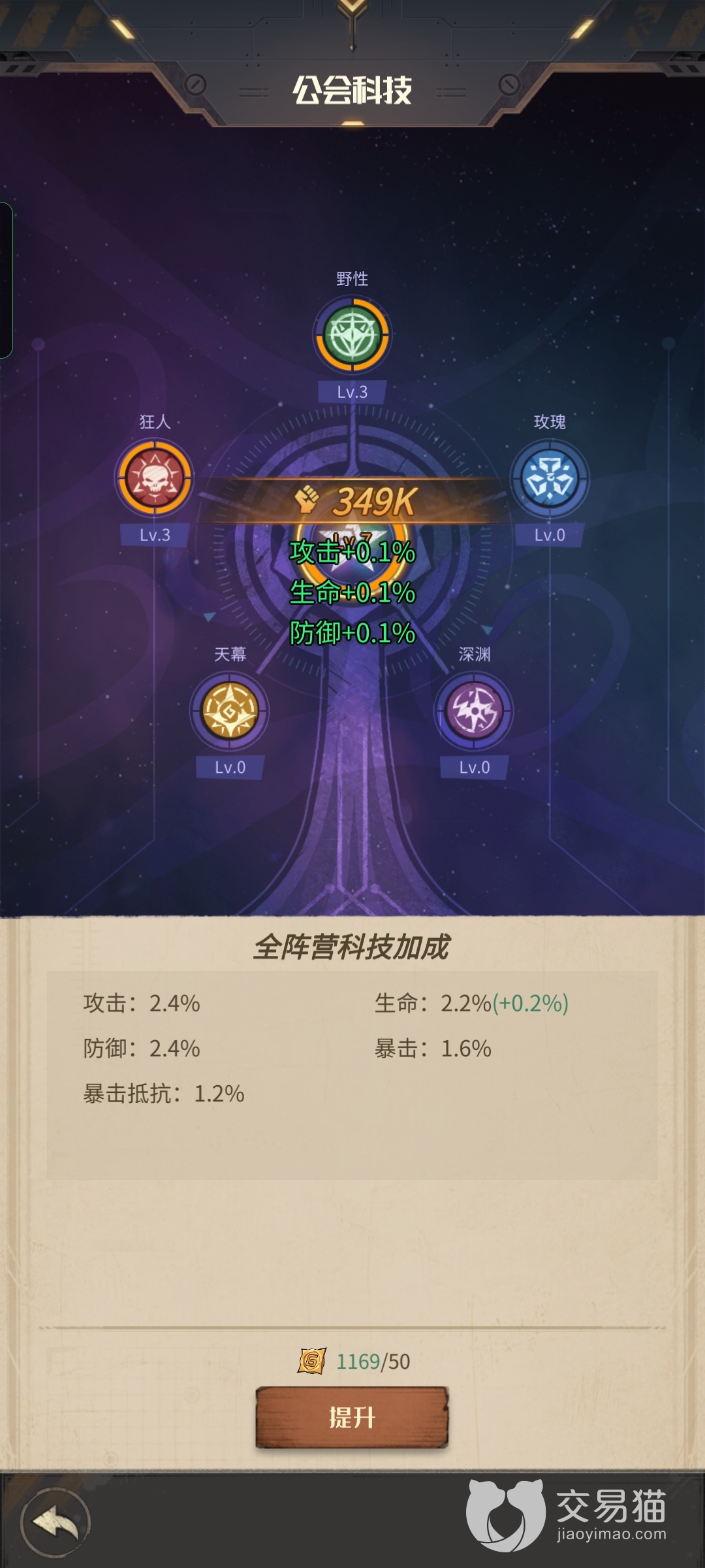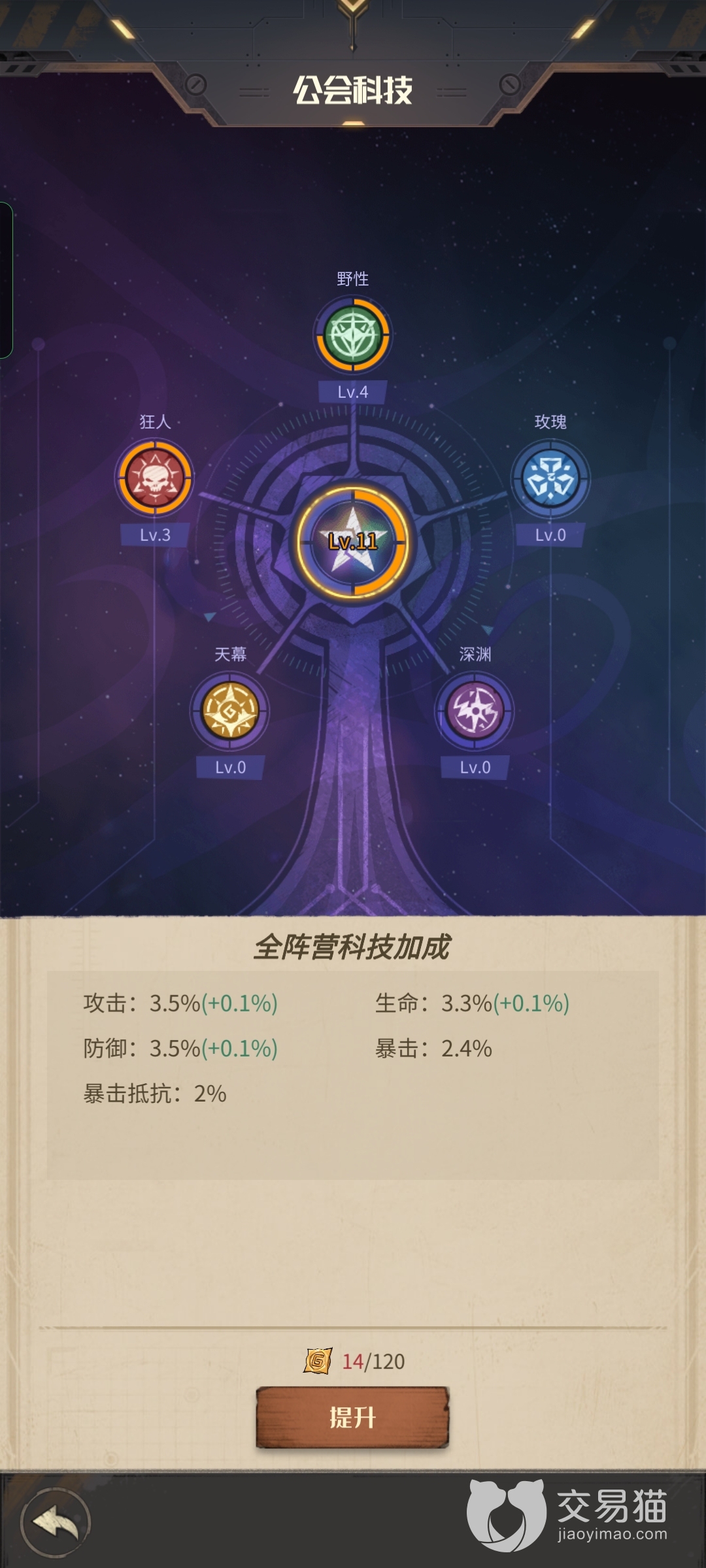 公会科技,首先玩家要点的就是中间的全阵营加成,点了这个加成可以让所有的角色实力提升,然后选择两到三个玩家角色最多的阵营提升实力,例如现在角色最多的野性和狂人以及玫瑰的阵营,这几个是很多玩家角色最多的阵营。