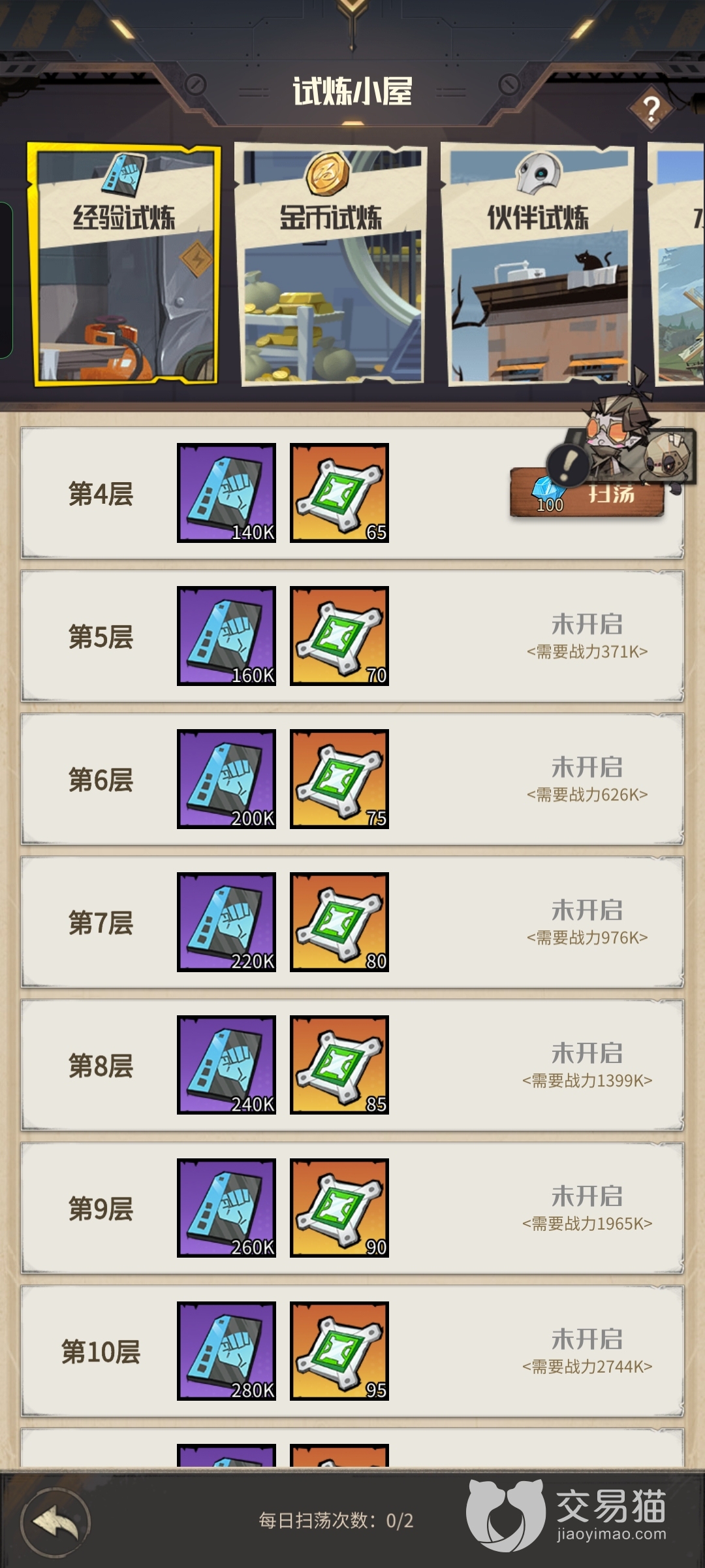 日常比较需要刷的就是试炼小屋了,这个屋子里面玩家可以获取每天需要的钱以及角色的经验,每天都能刷新一次,除了第一次闯关后面直接扫荡就能领取奖励。