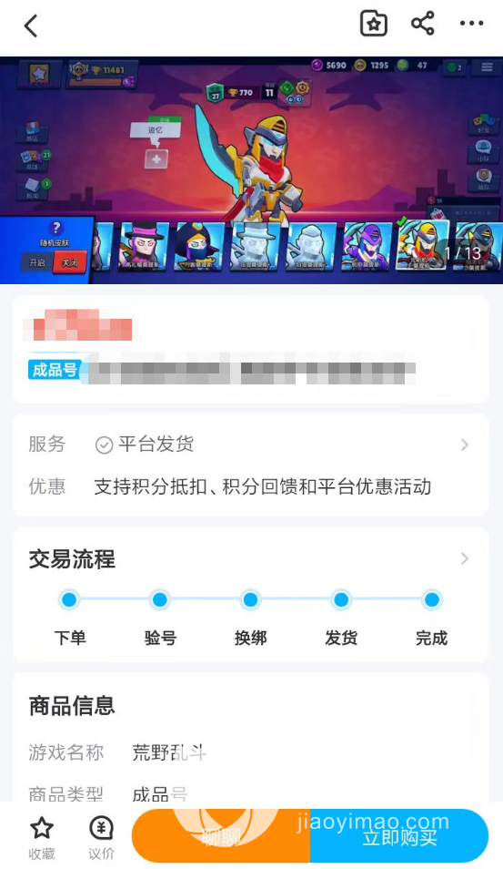 1、玩家们在进入交易猫选择荒野乱斗的游戏号时,小编建议大家认真的进入商品的详情页进行查看,在这里可以通过卖家提供的截图来了解到该账号当中包含了哪些高级角色。同时,详情页的下方,部分卖家也会将角色信息全部描述出来。