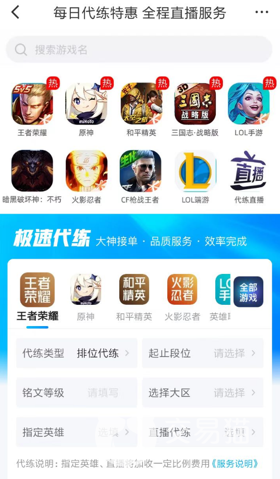3、而平台对于平时游戏时间不太充足的玩家,也直接提供了代练的服务。大家在代练专区当中可以发布自己的任务或者主动去寻找一个合适的代练。这些大神玩家将根据各位的要求,在游戏当中去不断提升账号实力。