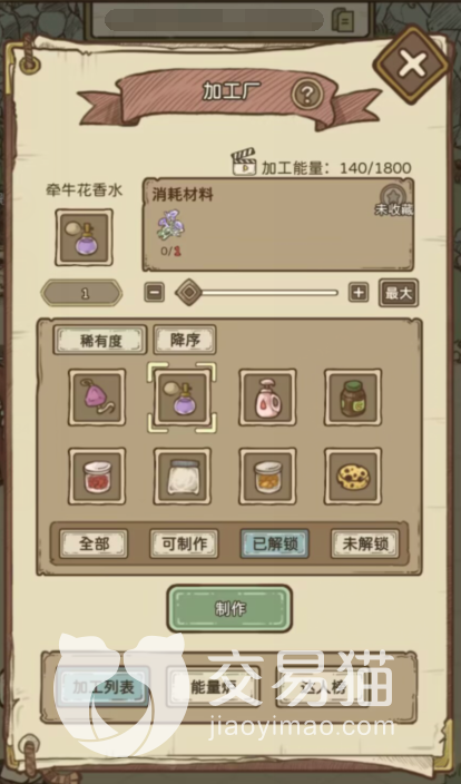 这些图纸大部分都是生产图纸,比如“【牵牛花香水】生产图纸”,在获得它以后,我们可以回到主界面,找到“加工场”,然后就可以在“加工列表”上看到已解锁的加工品,点击以后它还会显示所需要的材料,我们按照提示去获取就好了,非常便捷。