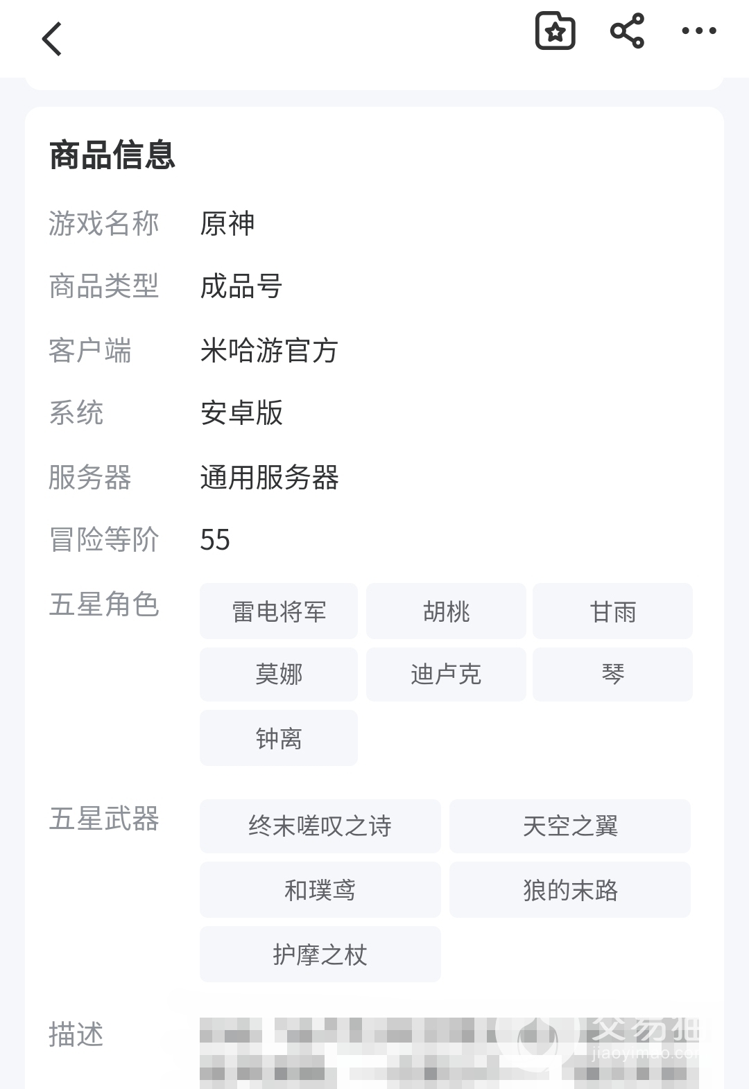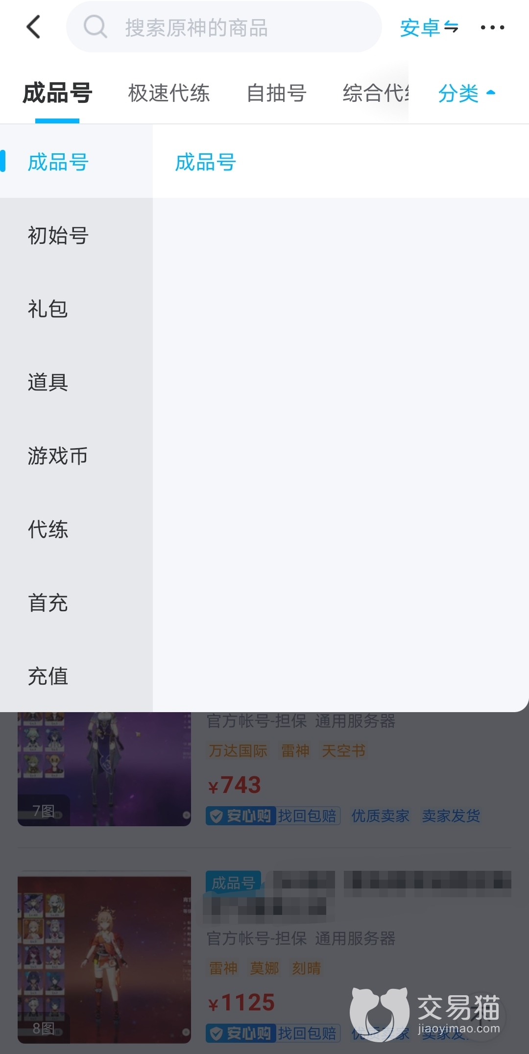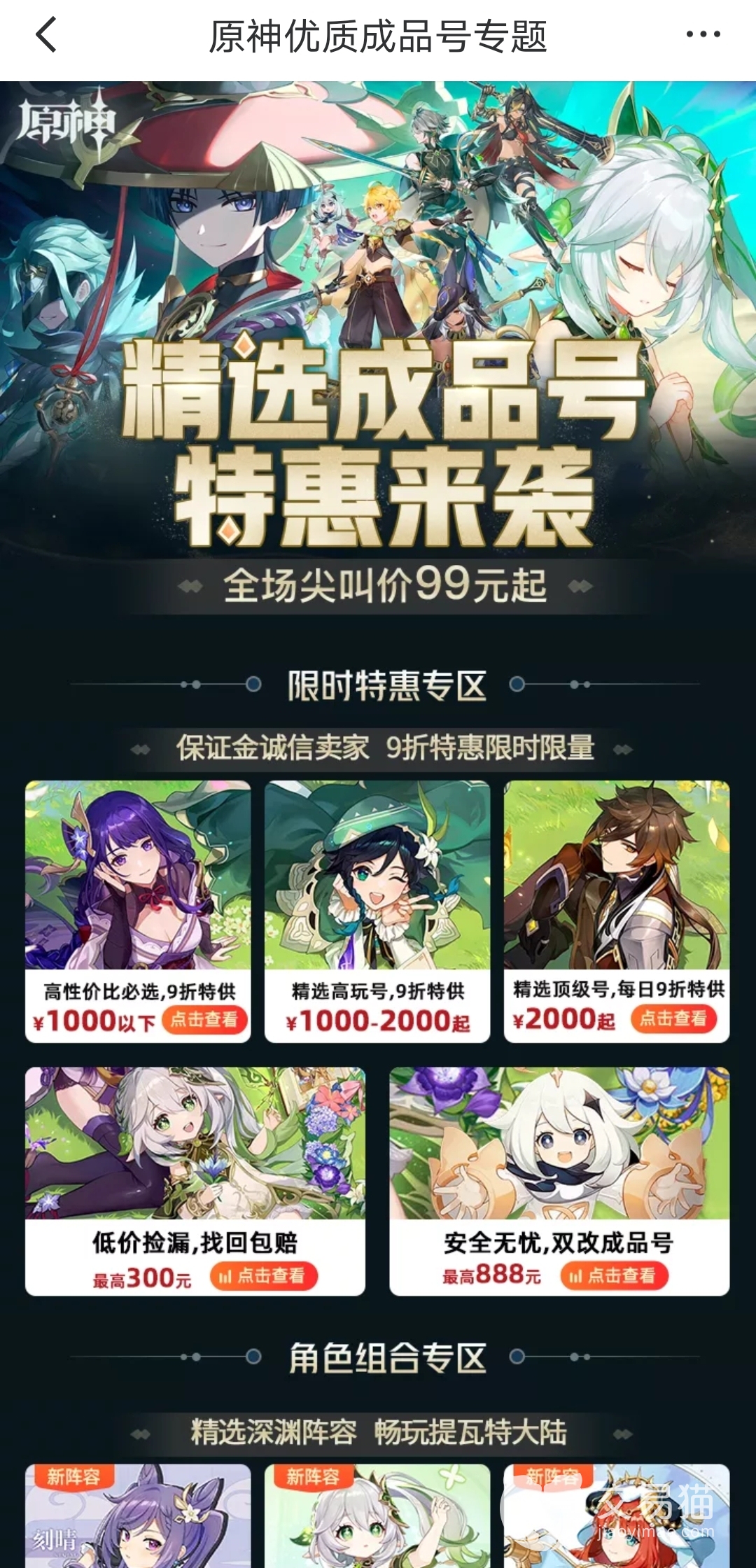 抽取5星角色要靠运气,而且角色人物都是随机出现的,很可能抽卡话费钱都购买一个原神成品号了。预算不够的小伙伴,也可以选择买自抽号、开局号。在交易猫平台上账号类型多样、数量多,能满足大家的购买需求。
