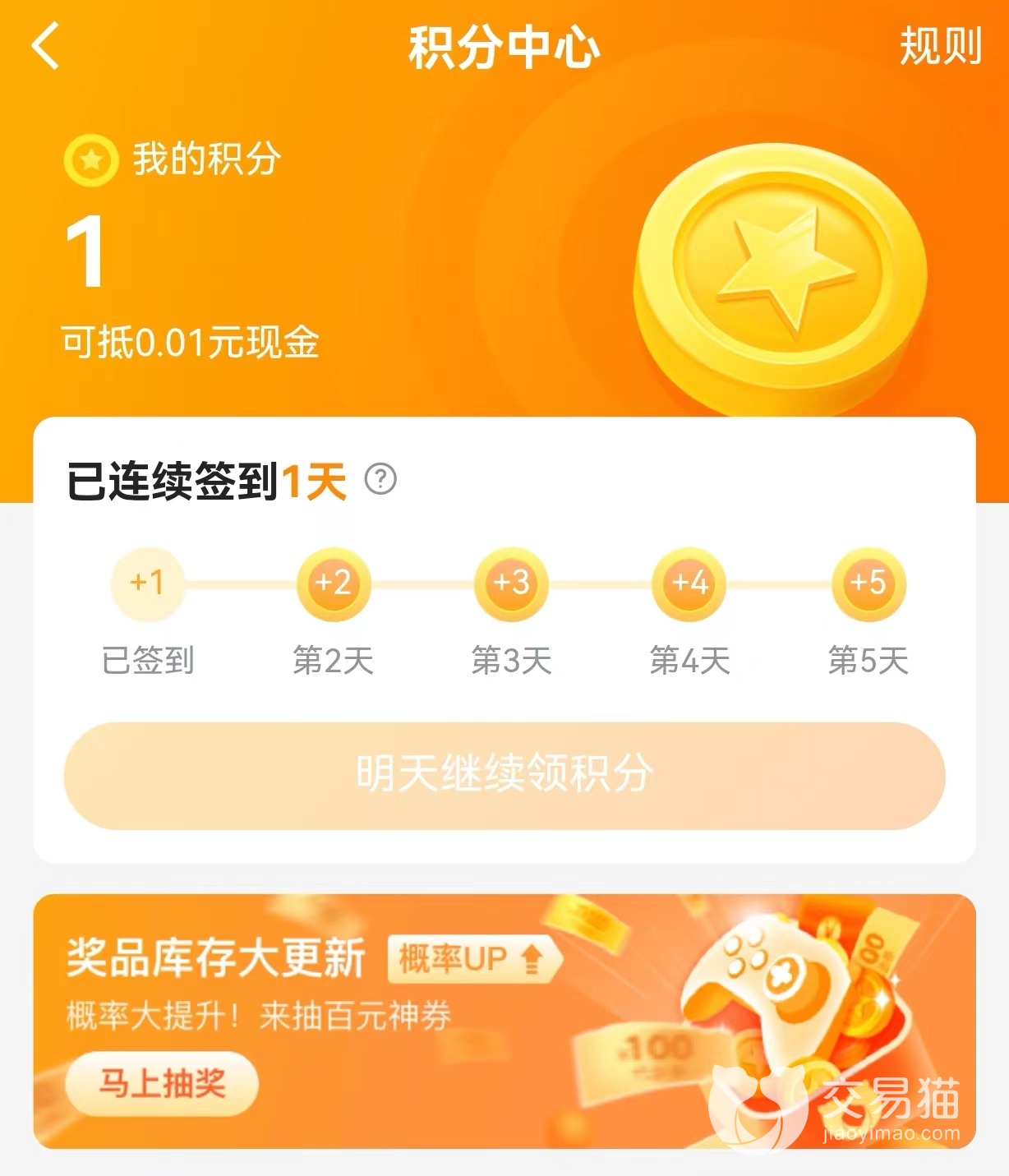 平台福利多多,用户每天进入平台签到可以获得积分,积分可以在交易时直接使用抵扣金额,一积分等于0.01人民币,活动期间交易猫平台会发放各种面值的优惠券,金额有的可以达到上百,也让买家用低价就拿下了心仪账号,这部分金额不会影响到卖家收益是由平台提供的。