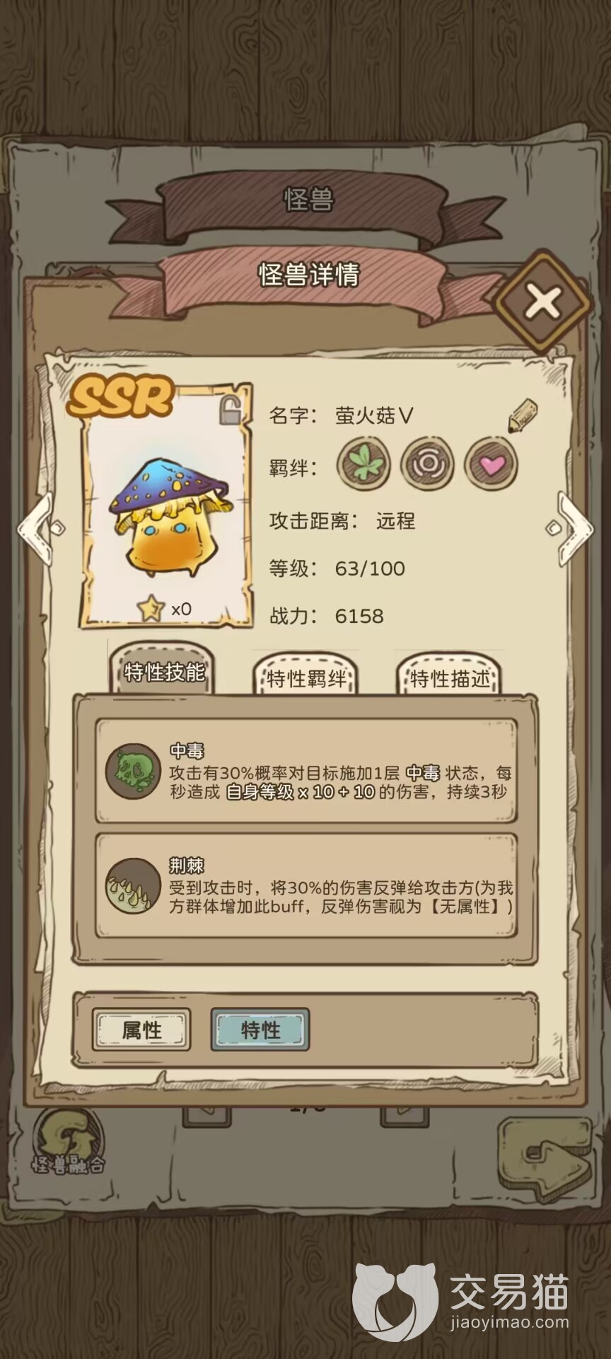 最后一个是ssr远程角色萤火菇Ⅴ,它也是一个远程角色,可以给敌方目标加上中毒的debuff,而且不需要特地释放技能,普攻就有概率让对方中毒,而且每秒造成的伤害也很高,除此之外,它的技能“荆棘”可以让它在受到攻击的时候有一定概率反弹回去。