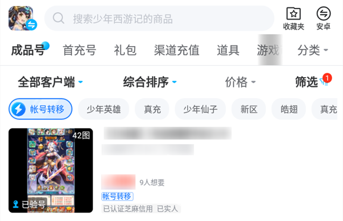 针对少年西游记这款游戏的账号商品,小编强烈推荐大家在检索的时候勾选上方的账号转移标签服务,账号转移是交易猫平台的一大亮点服务,其工作的原理是能够将一个账号内的角色、道具乃至游戏币等内容直接“剪切”到另外一个账号中。这样的话,在我们购买账号之后就能够将这些资源放到自己的号里,以此来将安全性能最大化。当然了,商品列表上方也会带有一些角色标签标签,如果大家有相关需求,也可以自由搜索或者是勾选,能够提高找号的效率。
