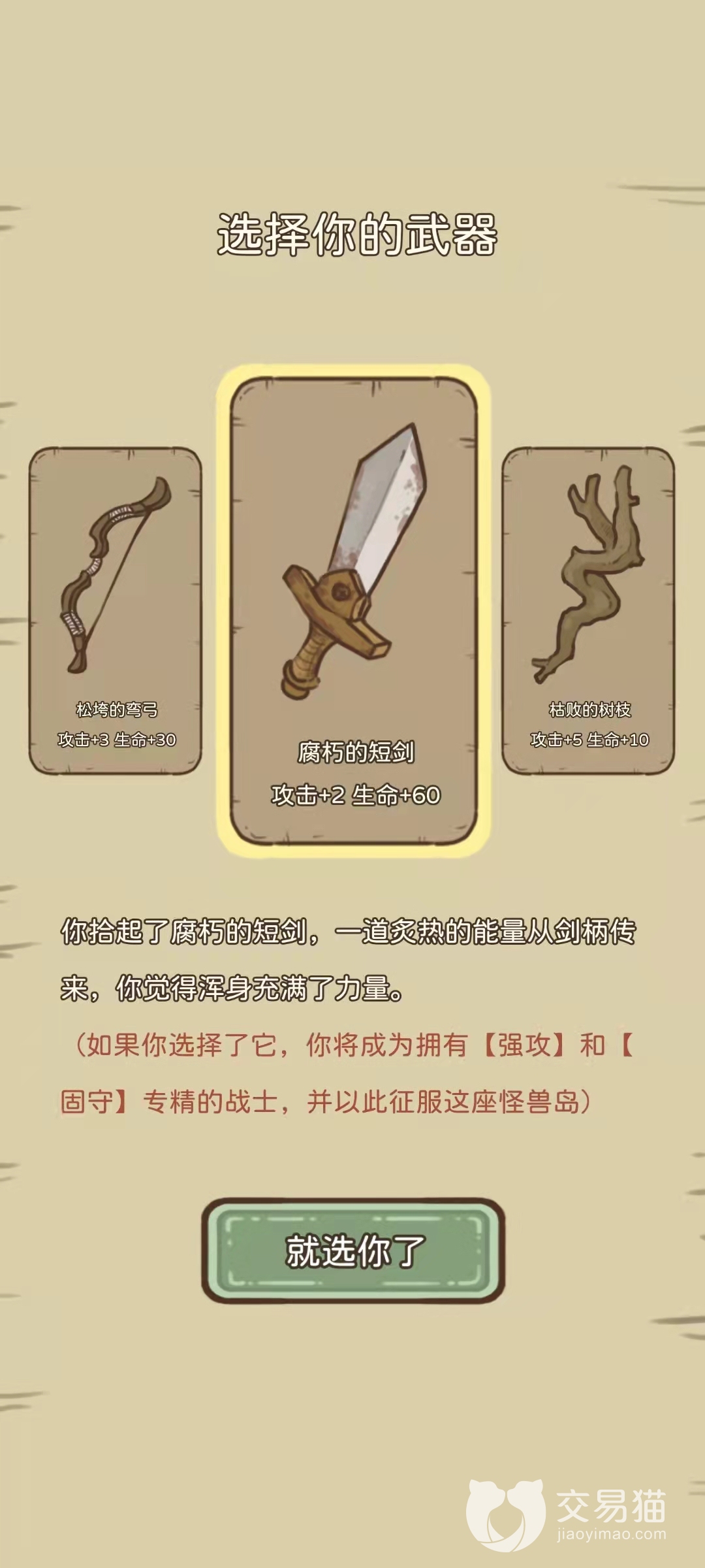 开局职业的话一共有三种,分别是持有腐朽短剑的战士,持有松垮弯弓的射手以及持有枯败树枝的法师,它们的攻击其实加的都很少,所以建议新手朋友选择战士,其攻击虽然比另外两个职业都要低,但多出的几十点生命完美的弥补了这个差距,而且除了手短点以外,它的专精也是完爆其他两种的。