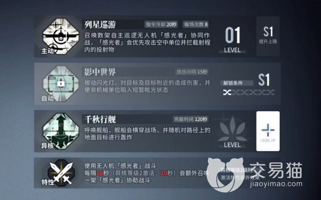 小缨子在使用异核技能之后可以召唤出舰船横穿整个战场,并且会对路径上的地面单位进行轰炸攻击。特性技能在小缨子使用无人机进行协战之后每隔30秒就会额外召唤出一架无人机进行协战,该技能在异核等级2级的时候激活特性额外的效果。
