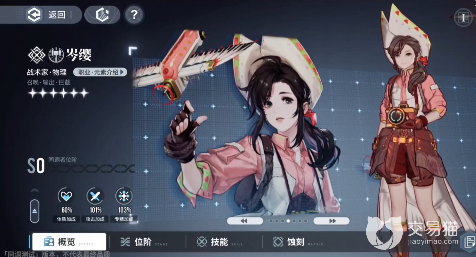 岑缨在游戏内品质定位是最高的稀有六星角色,她不仅在基础面板数据达到了S级的专精,坚韧加成和战技加成都达到了C级,小缨子最强的还是在游戏内的定位是可以随时进行轰炸的航母,她的技能机制和技能伤害都是非常出色的,基本上是人手必备的角色之一了。