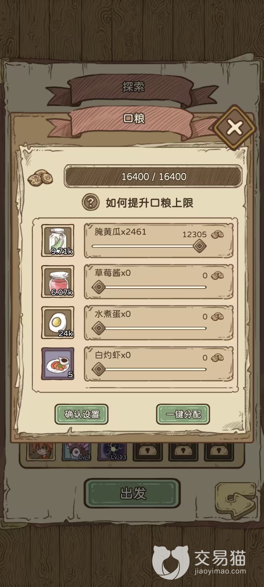 制作够了足够的口粮之后,我们点击主界面正中间的帆船标识,就可以进入探索界面了,在这里我们可以看到上面要我们提供口粮,点击后面的加入可以进行一件配置,然后确认设置,再点击“出发”,我们就可以进行探索了。