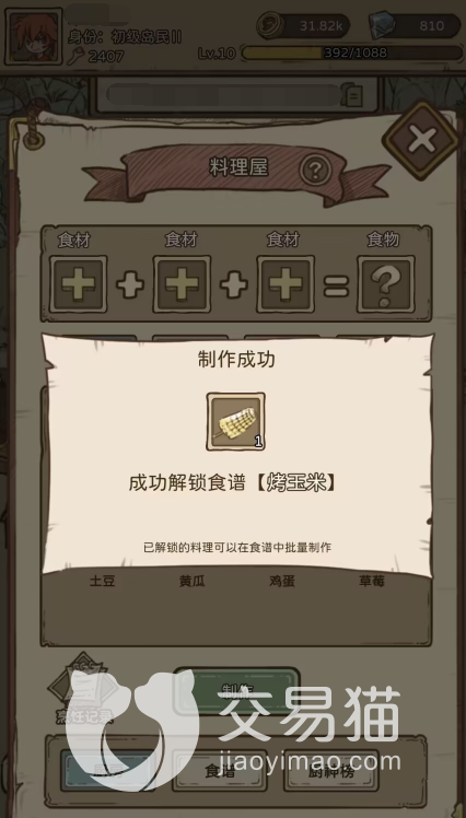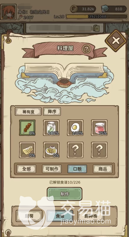我们首先来说下口粮的获取方式,这个我们需要先放置一个“料理屋”,然后点击“厨房”上面的物品进行制作,且所有物品第一次制作成功都会有一个解锁的小成就,然后我们就可以点“厨房”旁边的“食谱”,在这里可以看到我们所有的口粮。
