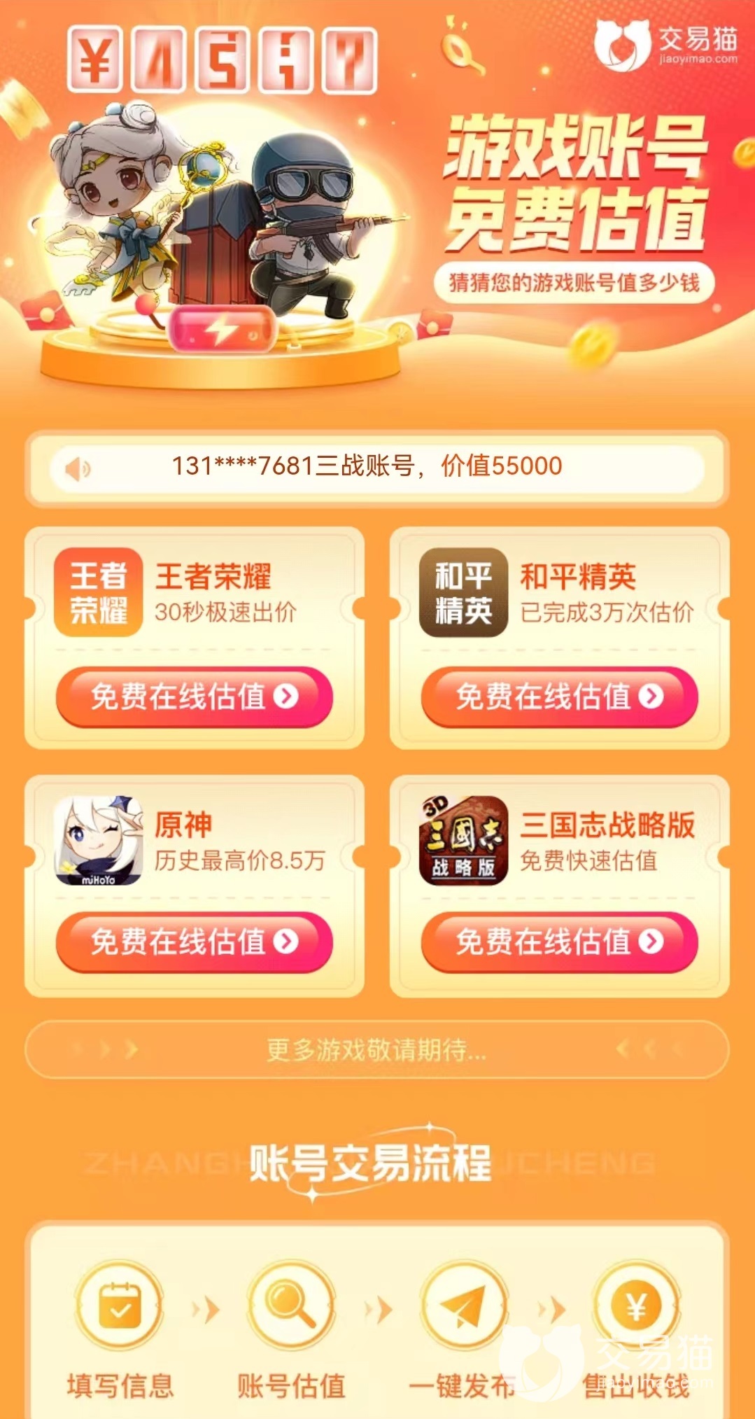 交易猫作为一款老牌的交易软件,每天都有海量和平精英账号上架和出售,所以积累了非常丰富的估价经验。为了方便出售者正确计算价格,免费推出了智能验号服务,只需要在估值页面中选择和平精英,然后逐项填写关键信息,就能快速实现在线估值。目前已经累计完成了3万次估价,帮助用户成功出售自己的账号。