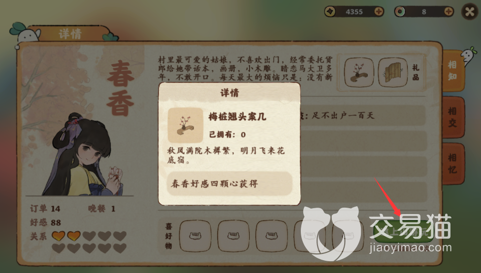 这些礼品就是我们的家具了,我们可以邀请目标上山游玩,然后赠与她礼物,我们会在可选择的礼物上看到相关好感度,点击最高的赠与就可以了。