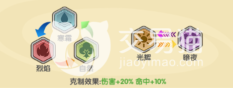 属性克制关系如下图所示,无非就是寒霜,烈焰,自然这三元素互相克制;较为特殊的就是光辉与暗夜了,他们都是互相克制的关系。克制效果还会提供20%的伤害加成,以及10%的命中加成。