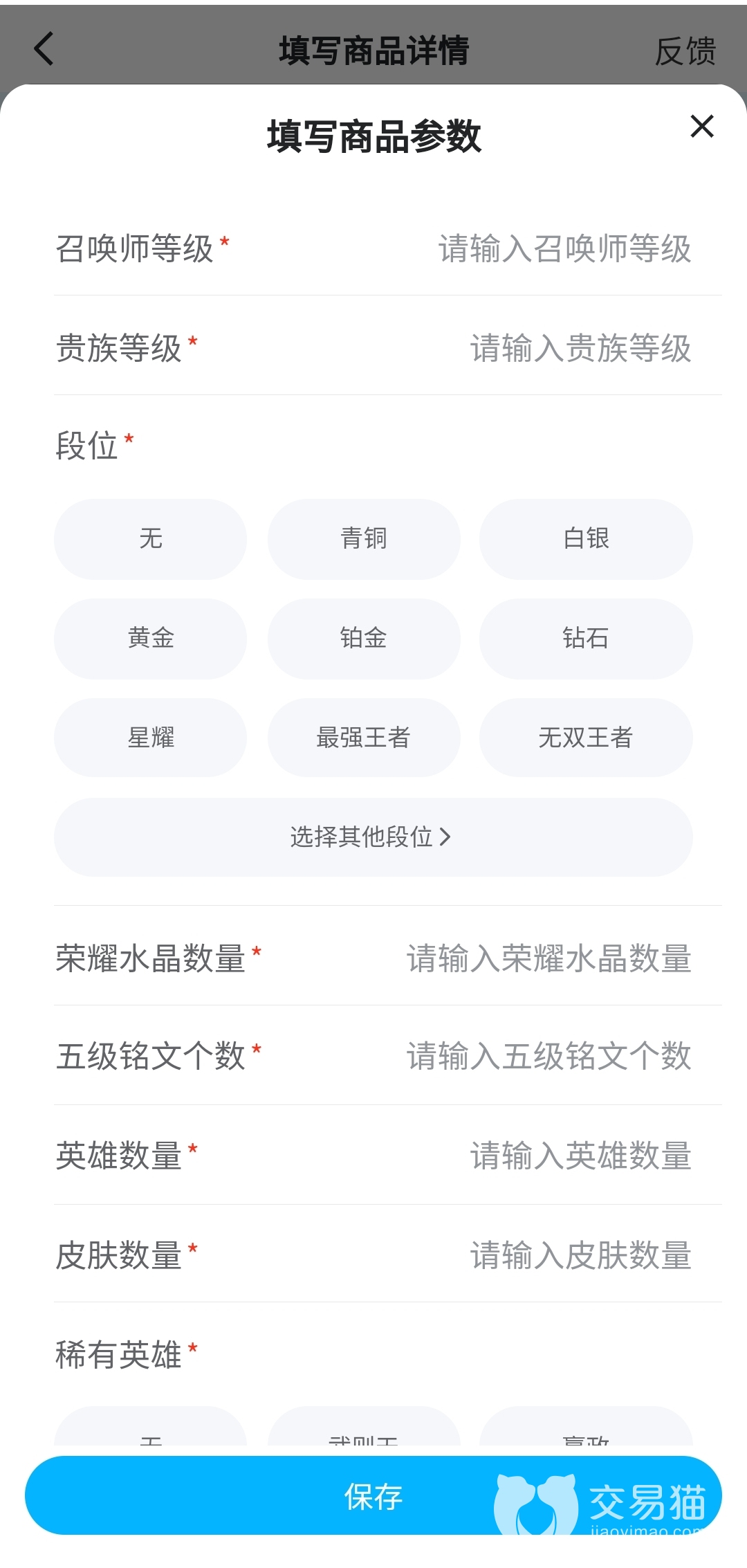 上架前期准备步骤也十分简便,平台已经规划好买家想知道的信息,各位只需根据要求选择、填写即可。荣耀王者段位的账号,基本都在千元级别,具体定价跟账号内已有英雄数、皮肤数有关,各自账号的价值,用平台的小工具一估就知道。