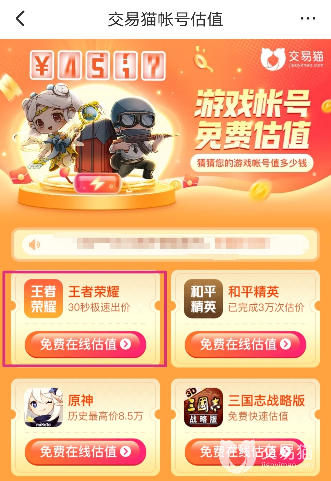 小编今天要推荐的这款app名叫“交易猫”,集估价、出售于一体,各位王者玩家没有时间精力再投入在游戏中,就可以将账号放到平台上出售,操作方式十分便捷,那么接下来小编就仔细讲一讲这款app。