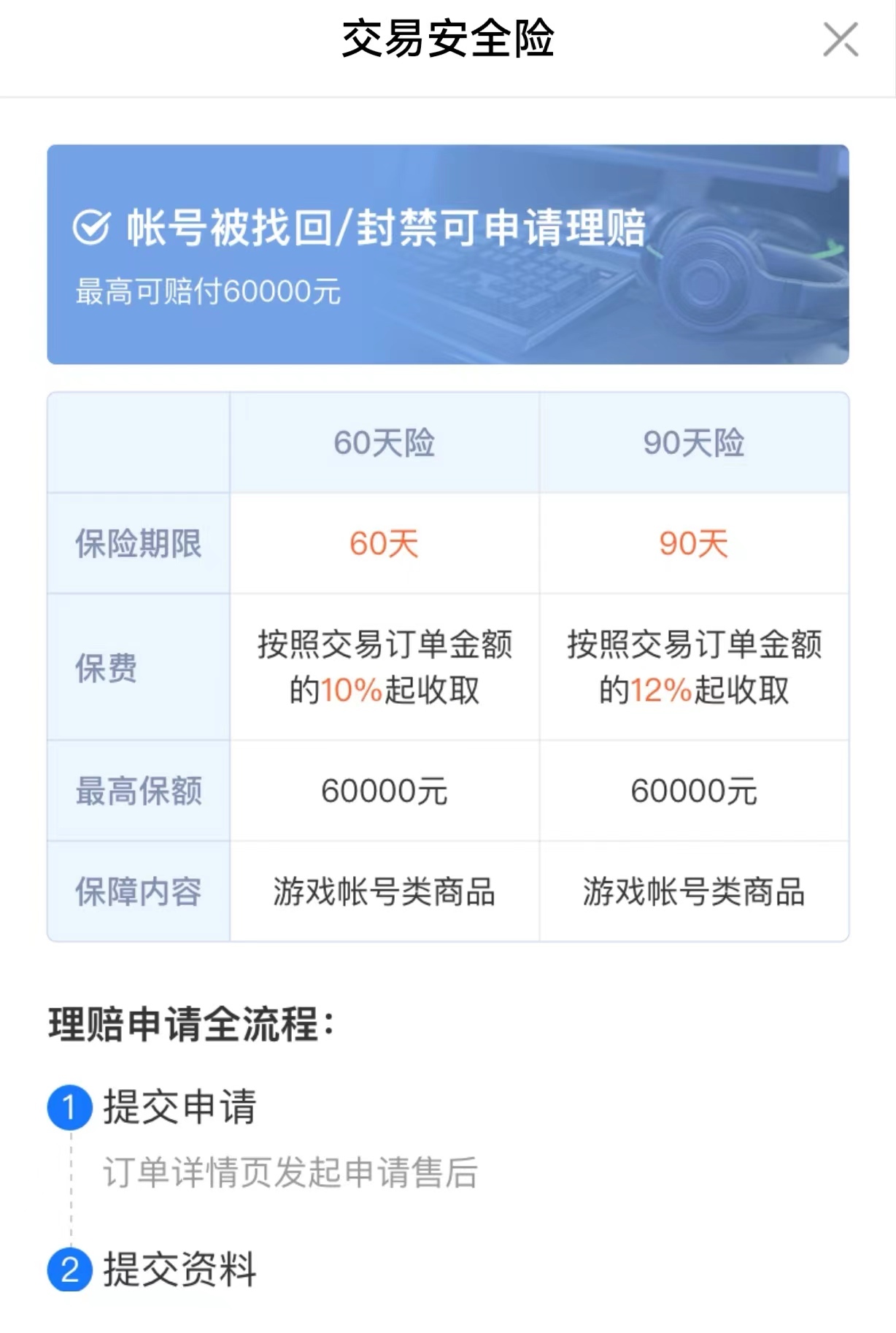 平台有专门解答疑问的客服和协助交易的客服,有任何问题都可以咨询他们,客服收到消息后也会及时回复,协助的客服会在交易过程中参与进来完成验号和换绑。部分账号是有安心购保险的,如果是购买账号后有问题,可以联系客服,提交证明的截图后客服会进行核实,然后平台就会介入一起解决问题,根据情况还能得到理赔,那些没有享受安心购保险的买家也可以在下单时选择投保选项有60天和90天两种,不过这个需要玩家自费哦。