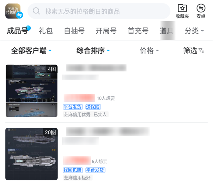 大家能够注意到,在检索商品的时候不仅能够看到这些账号的标题描述和价格,在下方还会标注上一些蓝色字体的服务标识。他们对应的就是账号本身支持的平台保障服务,一般来说带有的服务越多,享有的保障也就越多,交易起来往往更加安全。