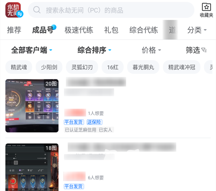 在这里找到条件相符的账号,就能够一目了然看到价格。对于一些已经售出的商品,还可以看到公开的成交价格,供我们进行参考。这里教大家一个小技巧,看到合适的账号可以收藏起来,这样的话在收藏夹内能够非常方便地进行比价。