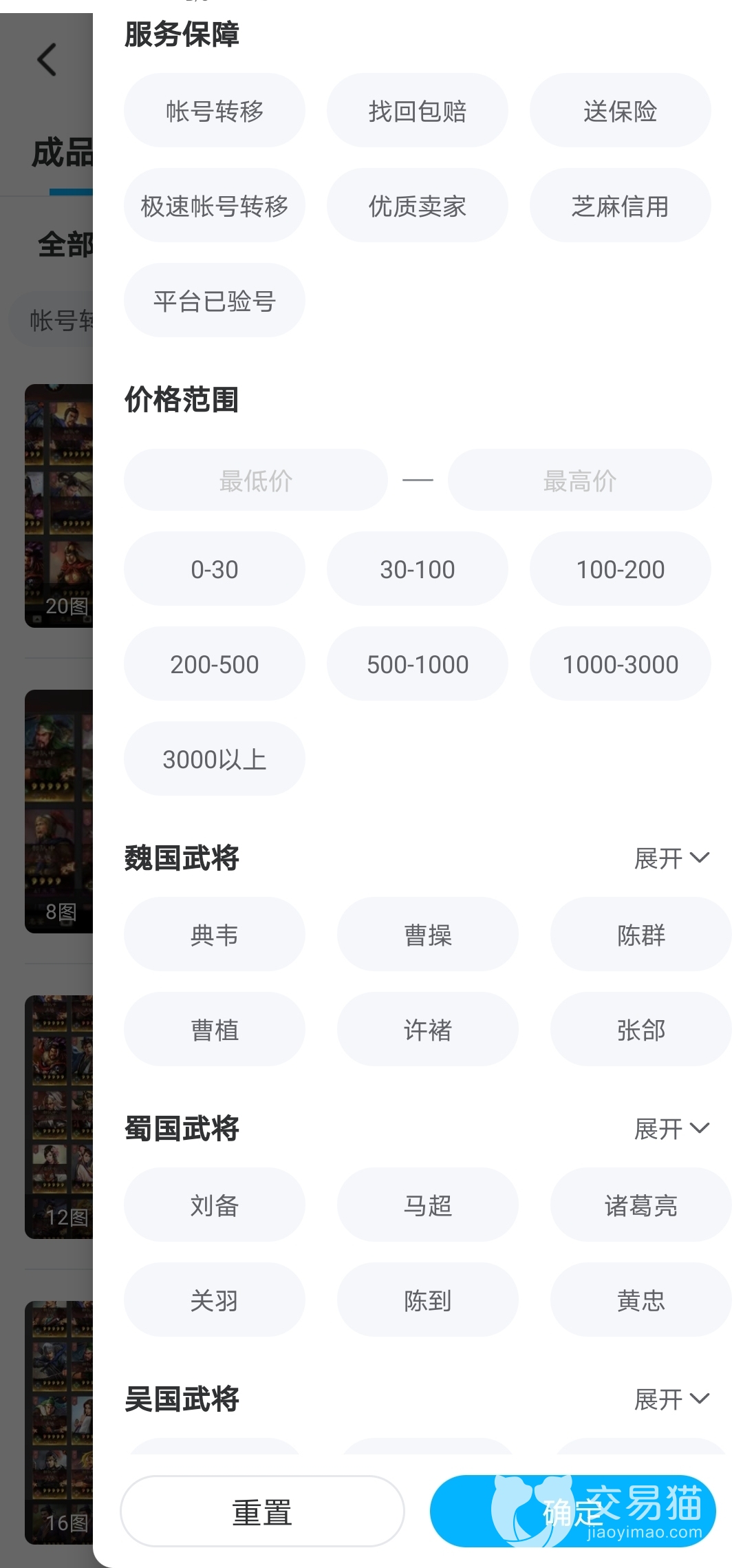 许多其他平台拥有的用户少,所以商品就单一、数量少,买家很难买到适合自己的账号。而在交易猫平台就不一样,不仅平台已开辟的游戏交易专区多,而且每一款游戏下的在售账号也十分多样丰富,大家想买的三国志战略版oppo账号在交易猫上也有很多在售。如此五花八门的商品,买家实际挑选起来却一点也不觉得麻烦,因为齐全贴心的筛选功能便于用户锁定商品。