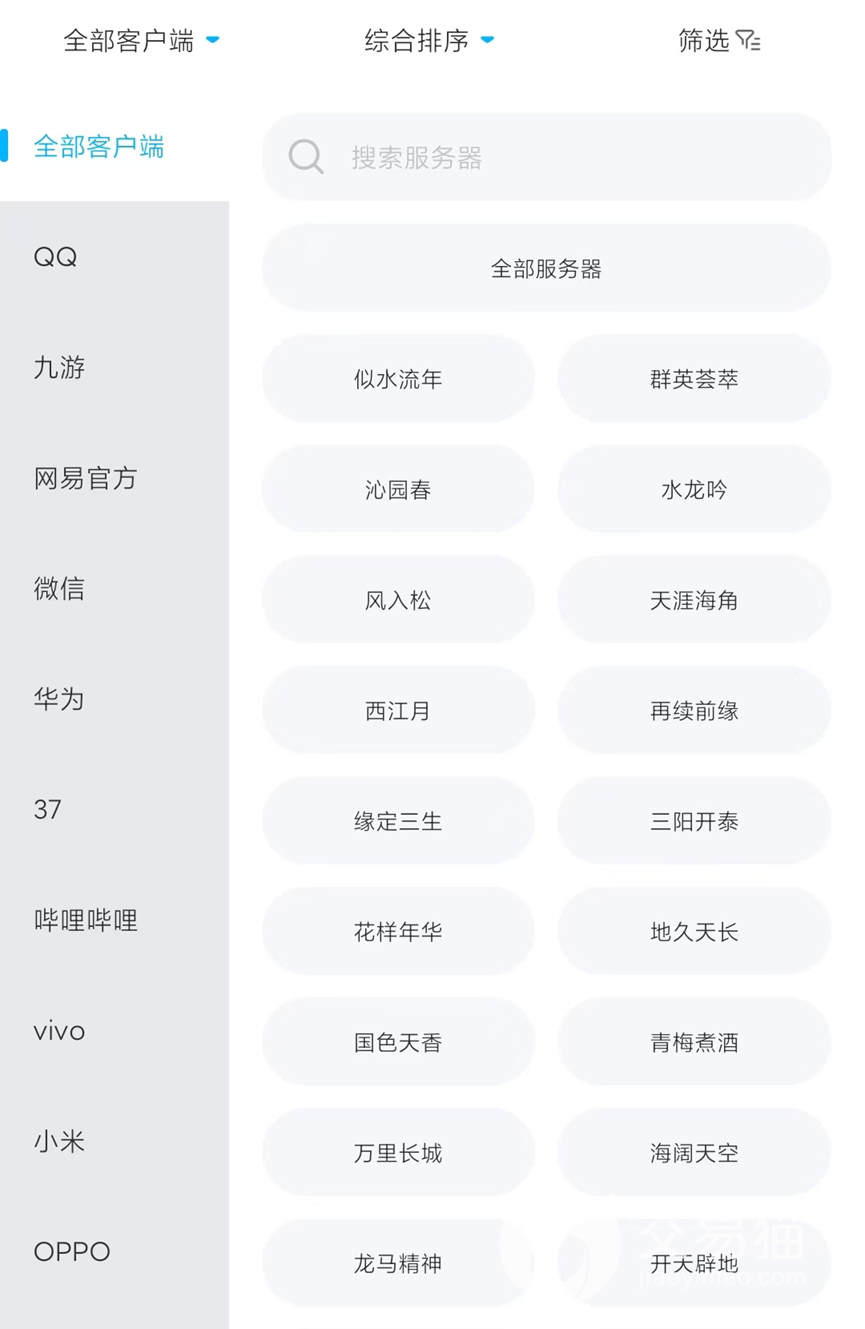 所有《梦幻西游》手游渠道服务器在交易猫内都是包含的,无论是小米还是vivo,或者是华为和OPPO,都可以在梦幻专区内通过筛选栏找到,查找方便快捷哦。