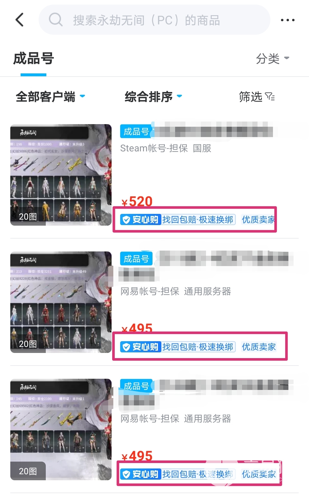 小编推荐各位在交易猫平台上买号的其中一个原因是:安全性。首先,不可否认每一个交易平台上的卖家都会存在质量良莠不齐的情况,不过交易猫不乏优质卖家入驻,这些人卖的商品往往保障服务多,许多商品都有找回包赔、保险赠送、极速换绑之类的标识,这样更便于买家分辨哪一款商品买来更可靠。