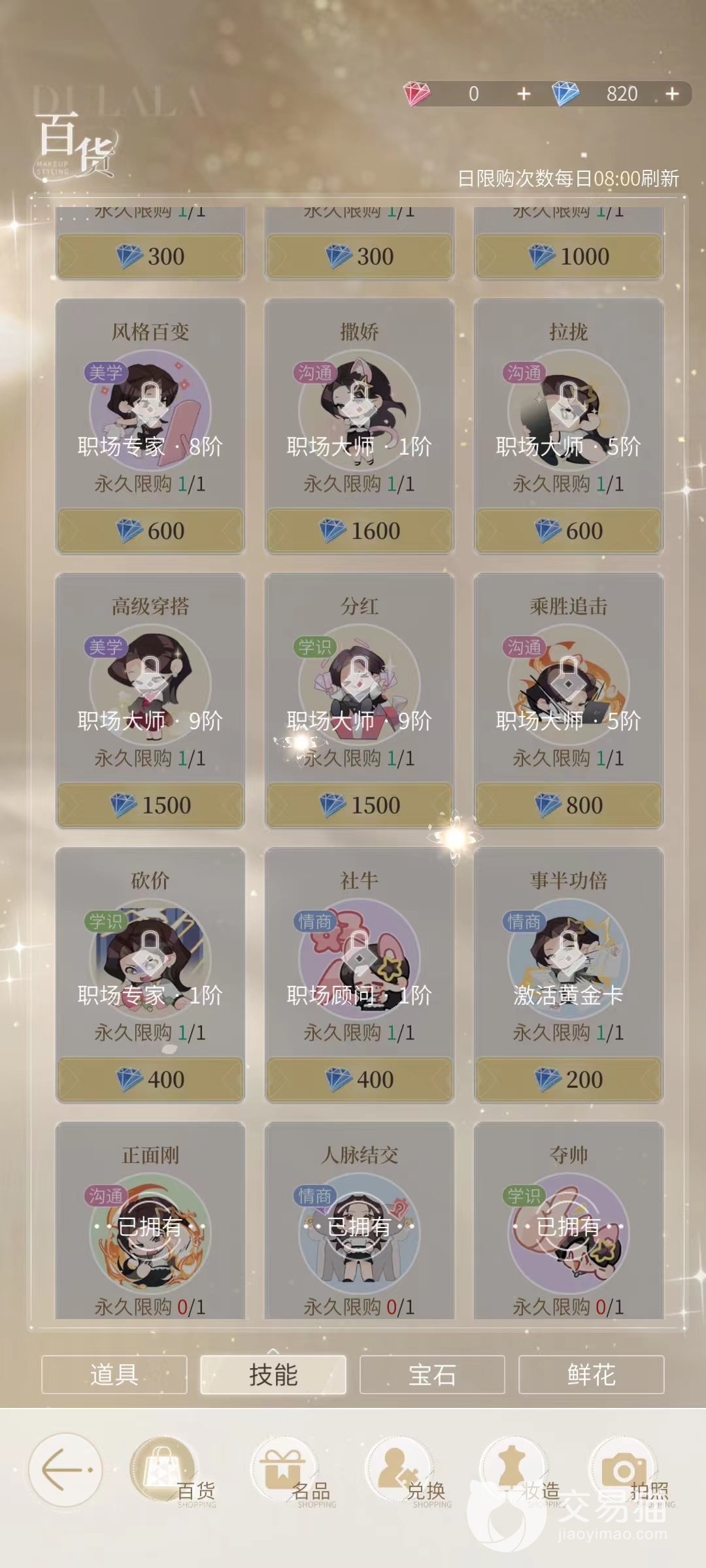 游戏中技能要获取相应的技能书学习获得,技能书玩家可以在百货商场中花费钻石购买。但是技能书购买是受到职级的限制,要提升到对应的职级才行。职级提升是通过升级技能获得技能点,获得足够多的技能点就可以申请晋升。