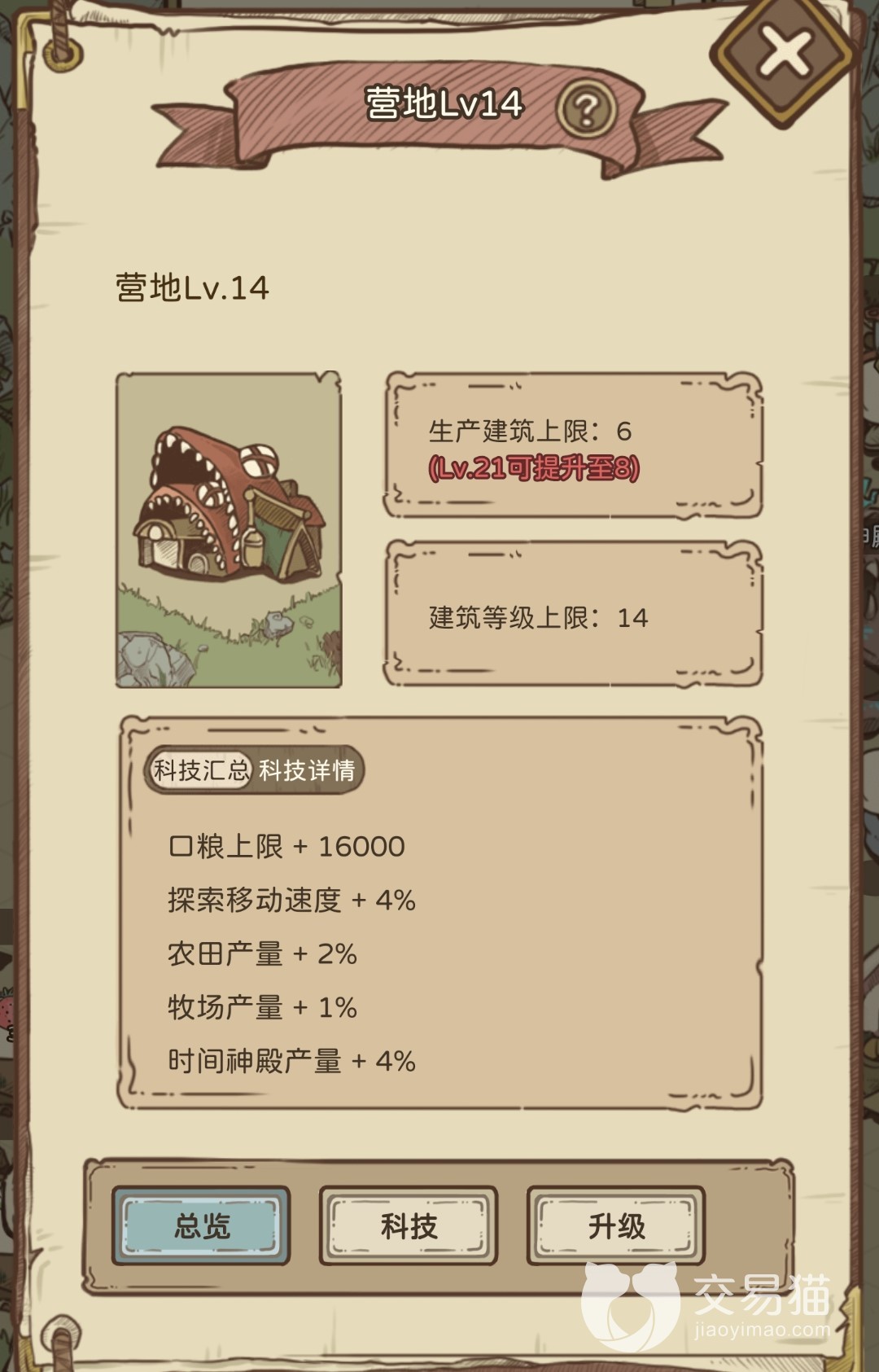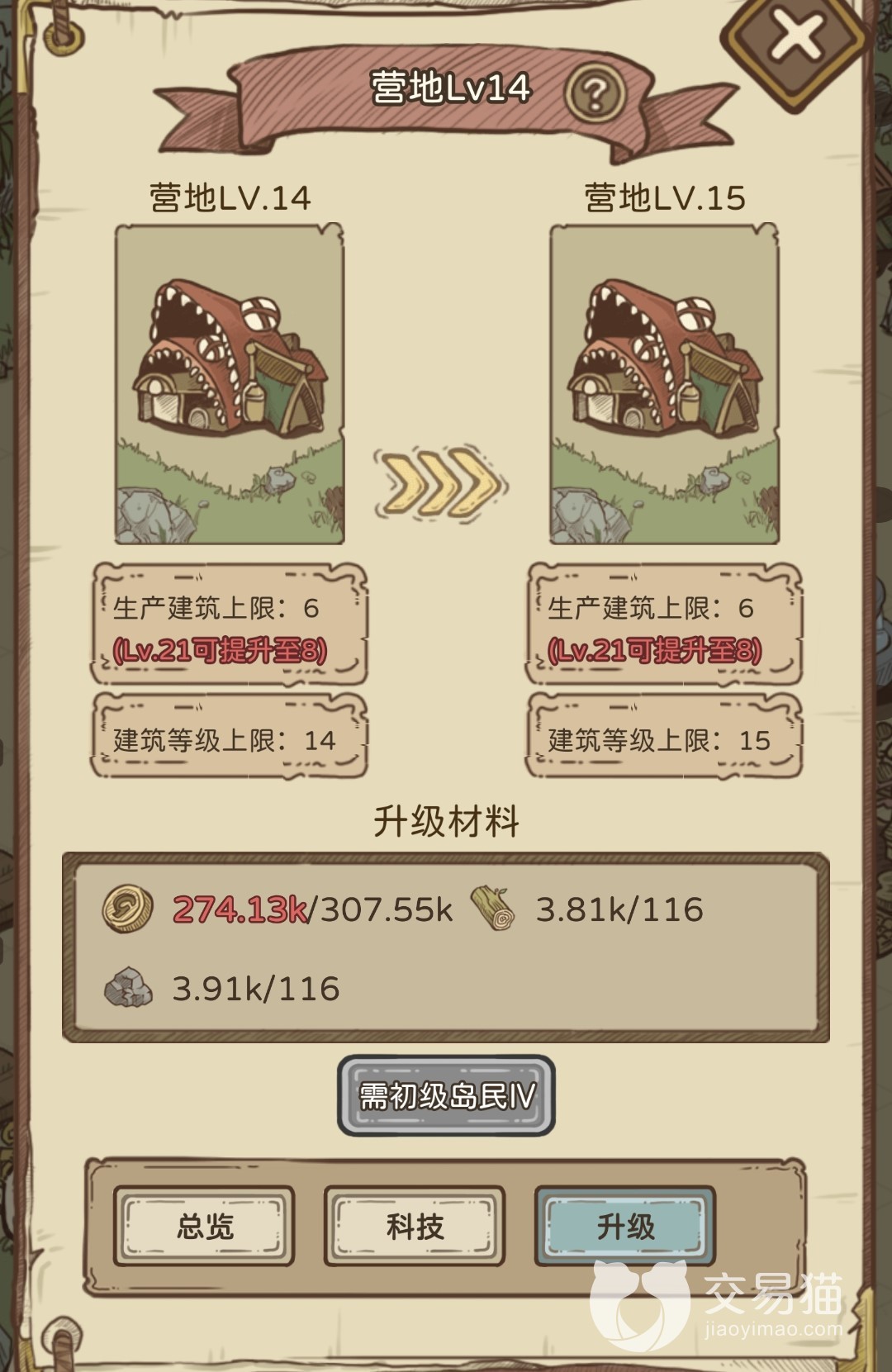 而将这里的也是需要额外进行等级提升的,这样才能将生产建筑的上线进一步提高,只有生产建筑的上限提升了,玩家才能够建造更多的农田和牧场。而这里提升营地的等级需要大量的金币,木材和石料并且还要达到指定的岛民等级才可以。
