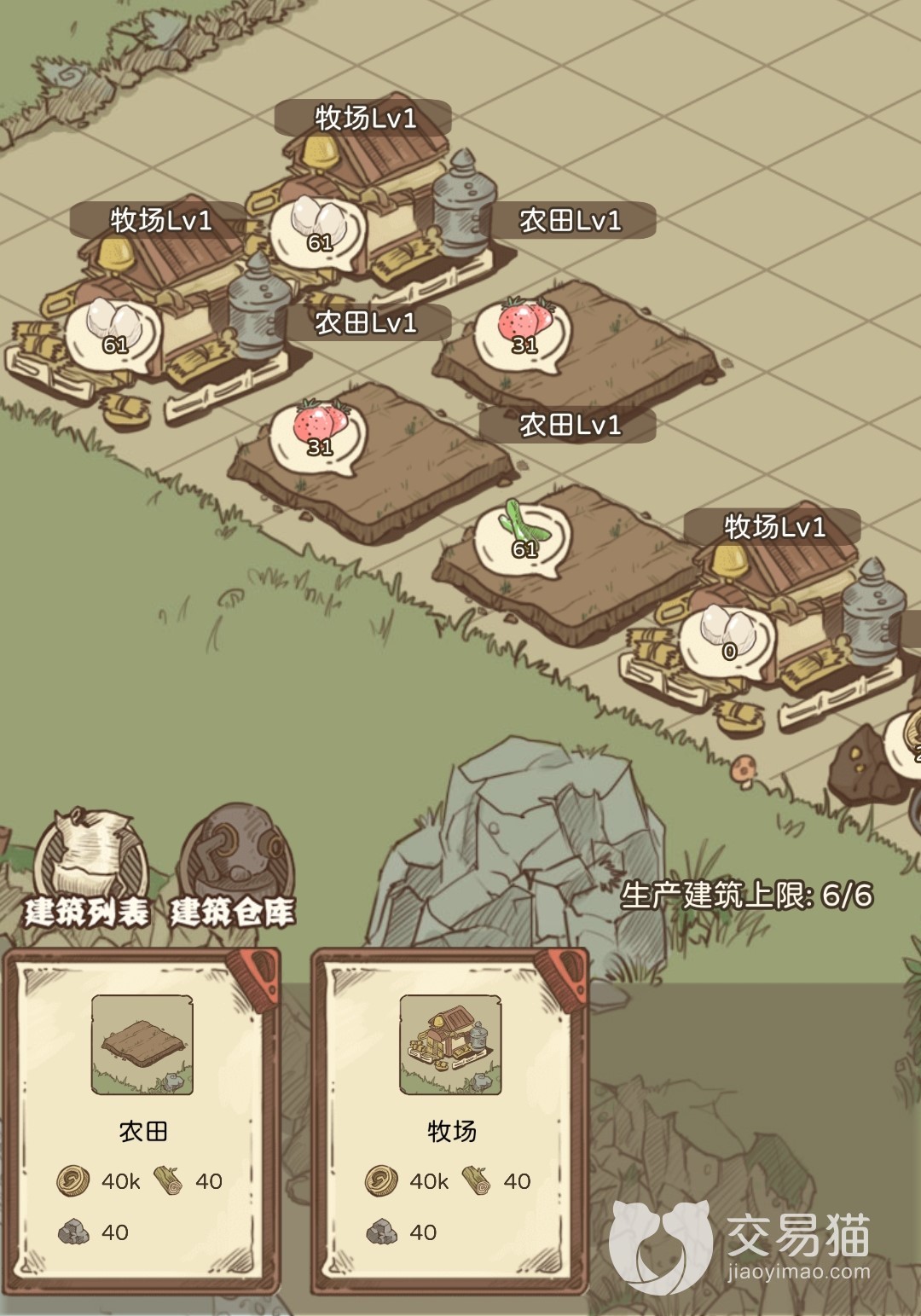 将这些建筑都建造好之后,后期能够建造的就基本都是农田和牧场了,这两种是需要大规模建造的,毕竟后期要生产的材料比较多。不同等级能够建造的数量是有限的。玩家通过提升角色身份能够提高这个建筑的等级上限。