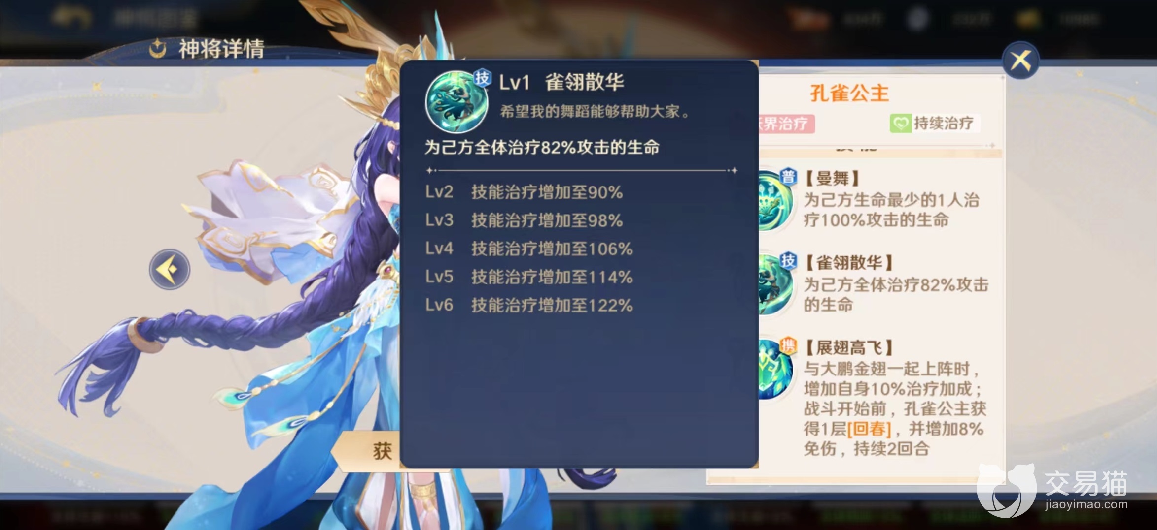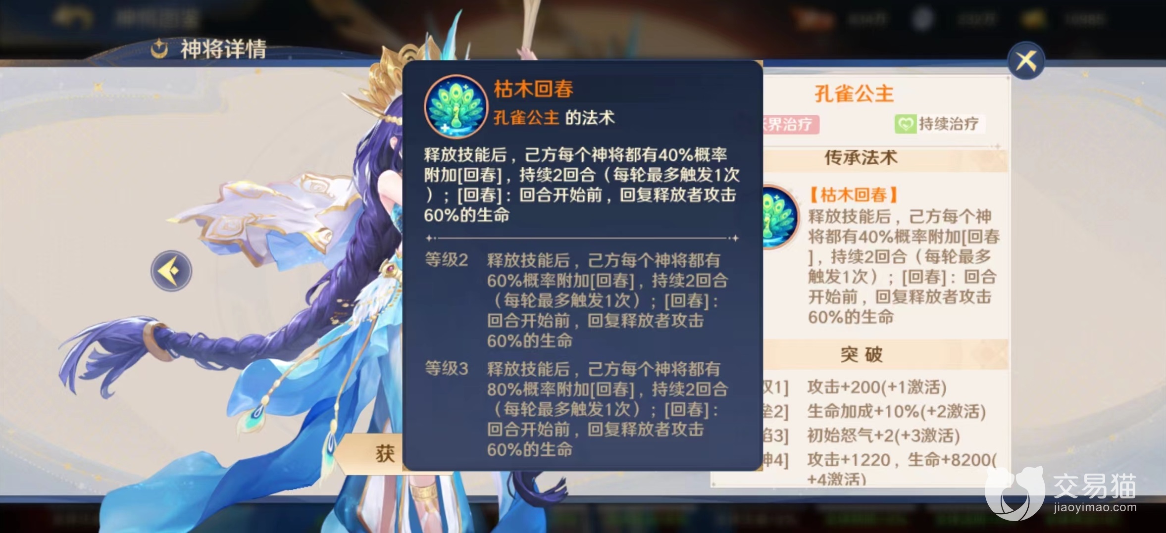 首先需要了解一下孔雀公主的主要技能效果,普攻可以选择己方血量最低的一名神将恢复生命值,大招将治疗效果扩展为全体目标,进行一次大范围的加血。和大鹏金翅一起上阵时触发展翅高飞效果,不仅能提升治疗效果,在战斗开始前还将额外获得一层回春状态。当孔雀公主达到突破5级时,释放技能后为全体神将附加回春效果。回春状态可以在每个回合自动回复少量生命值,不需要额外释放。达到突破11级时每次释放技能治疗加成提升,如果孔雀公主受到目标攻击时对方身上带有灼伤状态,则自身获得免伤效果。