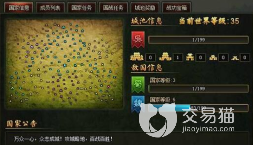 在游戏刚开始的时候,玩家们会扮演一个国家作为自己的代表进行游戏。一般来说,所属国家会一直伴随着玩家们整个游戏。我们可以通过点击国家信息一栏了解当前各个城池的占领情况,以及自己所拥有的城池和其他方面的信息,建议玩家们多多查看自己城池的信息,这样可以较为早一点知道自己的哪座城池被敌方攻下,并及时补救。