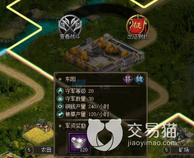 作为一个策略性的战争游戏,领土一直是玩家们必须管理好的重要组成部分。而且对于玩家们来说,领土也是游戏中我们获取基础货币的核心方法之一,我们的粮食与金钱都是从这里获得。矿场和农田分别产出铜钱和粮草。玩家们可以对游戏中空白的矿场和农田派遣队伍占领成功之后,便可以据为己有。