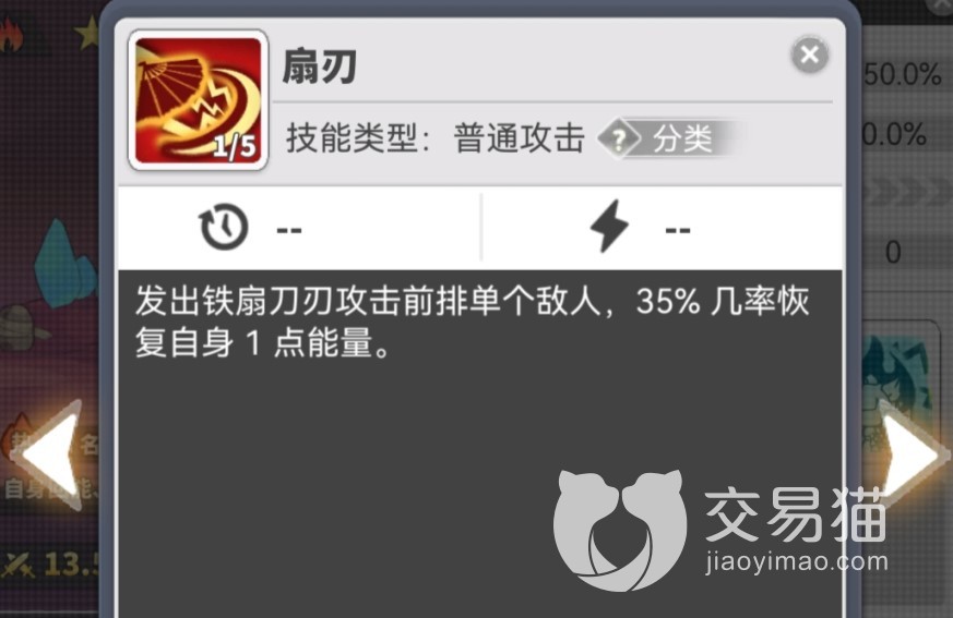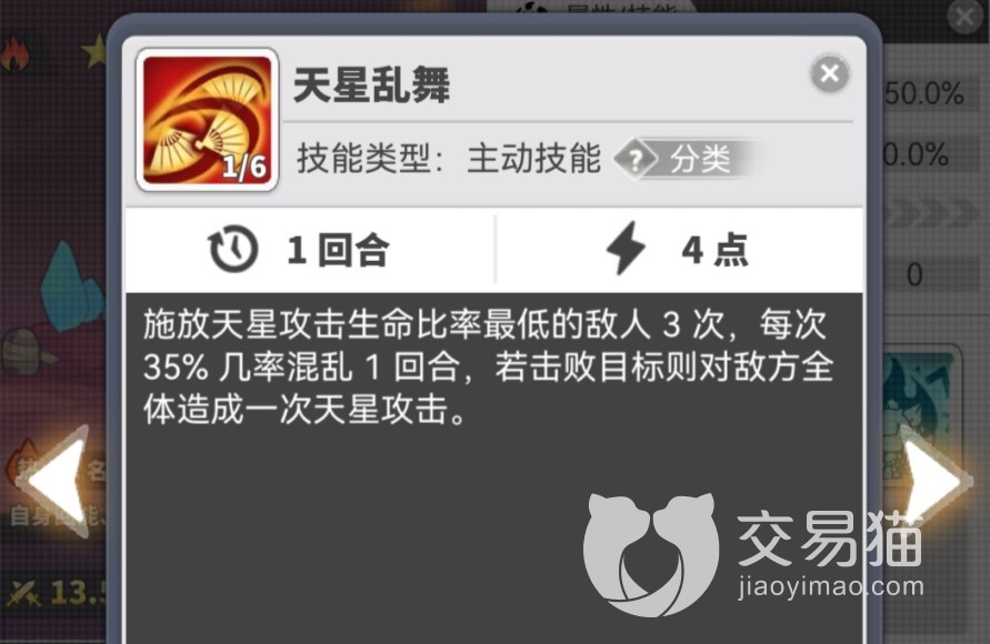 火狐狸普攻技能可以利用贴扇来攻击前排的单个敌人,概率恢复自身1点能量。主动技能可以施放天星来攻击场上生命比率最低的敌人3次,每一次都有一定几率使其混乱1回合,如果这次攻击击败了敌方目标则对敌方全体造成天星攻击。被动技能可以在狐狸释放主动技能时自身恢复1点能量,并且当自身的能量从未满变满时会立即获得回合,适合抢出手。