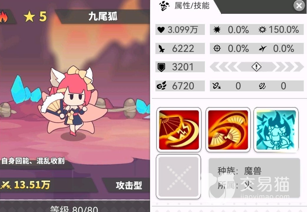 以上便是对使魔计划火狐狸怎么样的一番介绍,火狐狸的输出方式比较简单明了,在前期搭配火属其他角色可以用用,后期有更好的攻击型角色时,就可以被替代了。