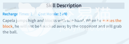 该角色的橙色主动技能翻译过来叫做抓帽,目前来说说白了就是他可以高高跃起,无视对手打断将篮球收入怀中,需要1400能量,可以充能两次,非常好用,可以说谁是取得球员的神技。技能升级还会额外增加抗干扰,技能范围,以及抓帽失败的能量返还,升满这个技能可以对上篮和扣篮动作起作用。