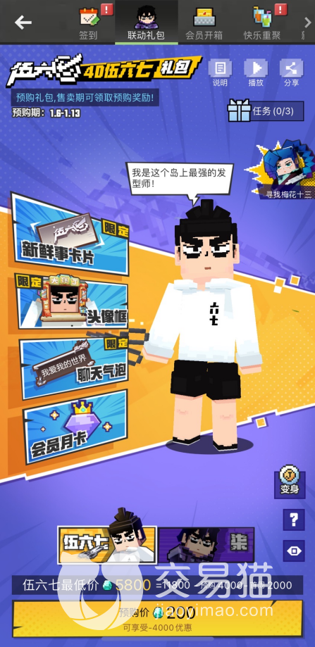 我的世界里有很多大神玩家自己富有创造力的作品,很多不同作品的角色都在这里变得惟妙惟肖,各具特色的方块构建具有别样的风味。这次官方推出了正版授权的联动,可谓是双厨狂喜了。在本次联动宣传里,官方宣布会加入刺客伍六七的其中四位主角人物,同时上新相关的主题和内容玩法,并且推出了相关的冒险盲盒。