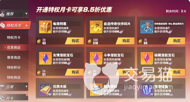 从1月5日开始,所有玩家都可以在商店里购买一份“佳妮法”的残片,然后去拼成一个完整的角色。其实还有另外一种方式,那就是你可以在优享商店里从你的特权选项里,用它来换取你想要的残片。以黄金周为例,一颗蓝色 b级角色要七十五颗果实,而佳妮法的紫色 A品质,应该更高。