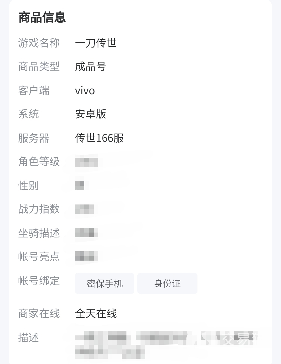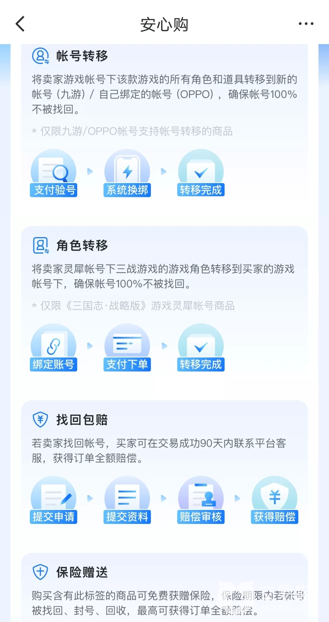 许多入驻平台的卖家都是真心实意想卖号的,所以也都尽可能让买家更加放心,这样成交率就高。一刀传世这款游戏的大部分商品都有多种安心购保障,比如账号转移,即将卖家游戏帐号下该款游戏的所有角色和道具转移到新的帐号(九游)/自己绑定的帐号(oppo),有这一保障的商品最大的好处就是,账号100%不会被卖家找回;找回包赔,如果卖家找回账号,买家可找客服申诉,并获得全部赔偿,有效期达90天;保险赠送,卖家为商品预先投了保,买家购买此账号可免费获赠保险,保险期内如果账号被找回、封号、回收,都能得到赔偿。