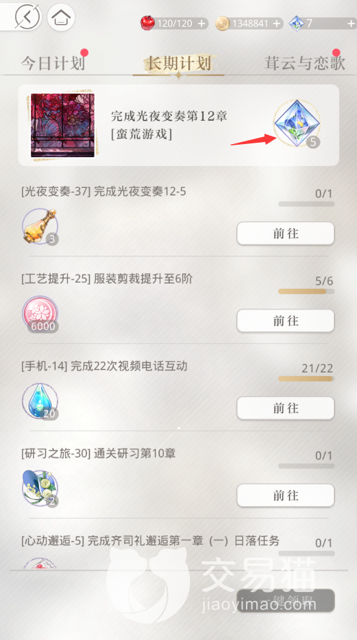 第二种就是通过完成游戏内的剧情章节来获得了,我们点开游戏主界面最下方的“计划”,然后进去可以看到有一个“长期计划”,下面会显示我们正在进行的任务,并且最上面的一排就是目前我们所在的章节,以及完成章节后所可以获得的北极星数量。
