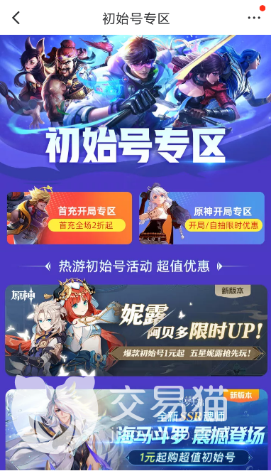 3、安全问题得到了解决,那么玩家对于交易的多样性也需要得到解决。除了大量的高级游戏账号,在交易猫app当中也会提供丰富的初始号,初始号也分为自抽和开局,这些不同类型的基础游戏号,会为玩家们提供一个更棒的游戏体验。