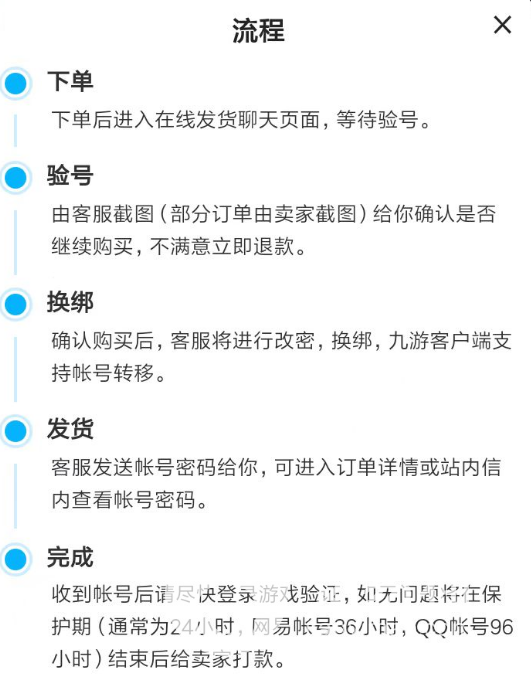 3、而对于安全问题更在意的玩家,也可以了解一下交易猫完善的流程机制。大家在开启任何一件商品交易时,都需要完全按照平台的步骤去执行,买方还可以在验号这一阶段中拥有终止交易的权限,有效避免买到各种不实账号。