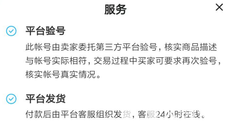 2、同时,各位在交易的时候也需要了解一下商品所支持的服务有哪些。不同的商品在服务中自然有所差别,但玩家可以尽量选择包含了平台验号、平台发货这些服务的商品。有平台来介入大家的交易,会让整个过程变得更加安全。