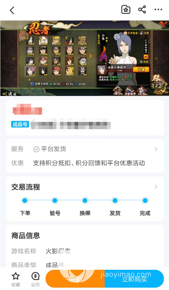 1、在交易猫app当中,各位可以轻松找到大量火影忍者手游的成品号,各位在查看这些商品的时候,尽量进入到详情页去了解。因为详情页不仅会展现大量的账号信息,玩家还可以通过卖方提供的游戏图片来了解账号内包含了哪些S级以上的稀有角色。