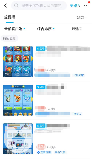 1、想要快速获取一个全民飞机大战高级号的玩家,建议刚进入交易猫之后,就直接来到成品号频道当中。该频道只为玩家提供各种热门和冷门游戏的高级号交易,所以玩家们可以更轻松的利用搜索功能在频道内找到大量全民飞机大战的成品号。