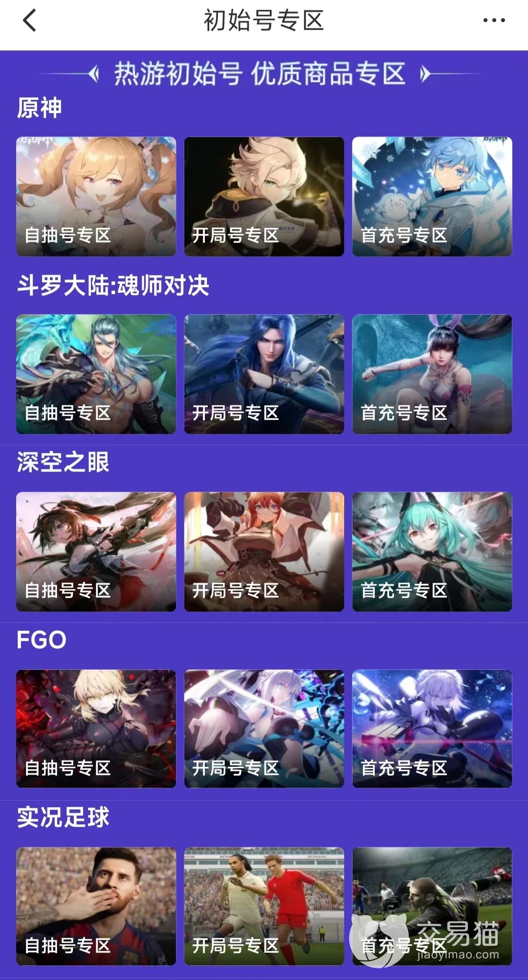 初始号作为一种广泛被玩家们接受的游戏资源号,在很多游戏中都有类似的设定。如果恋与制作人的玩家只是玩腻了某个角色想要换套路,那么在交易猫还挑选这个游戏的自拍号即可。但如果是玩腻了这个游戏想换个游戏入坑,是否也会想要知道哪些游戏有这类资源呢?交易猫的初始号专区就专门为玩家罗列了各大热门游戏的自抽号、开局号和首充号资源,方便大家挑选。
