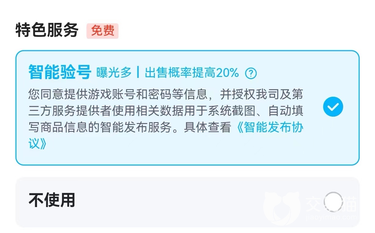 账号上架也很简单,就算是第一次使用交易猫的玩家也可以上手就会,先选择首页正下方的“卖账号”,进入后可以搜索游戏输入“火影忍者”,火影有一个特色服务智能验号,可以提高账号曝光度,选好之后下一步就是填写账号信息、上传游戏截图,最后写好售价就算完成上架。