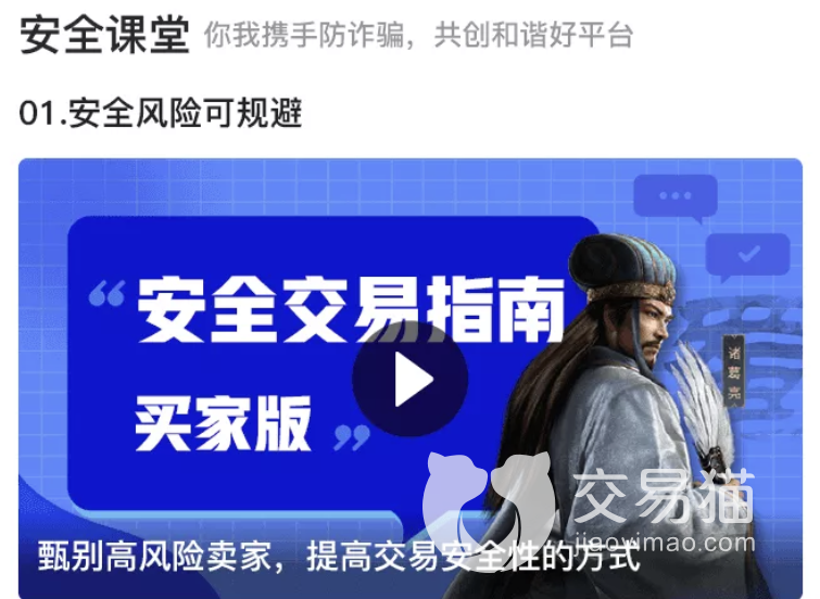而且对于各位小伙伴来说,交易猫的操作流程也是很简单的,玩家们在看到心仪的账号之后直接购买就可以,平台会帮助我们进行验号换绑等操作,没有太多花里胡哨的步骤,我们只需要在客服的协助下完成交易就可以,整个流程全透明化,我们有任何不懂得问题直接联系客服处理,同时在交易之前,玩家们也可以查看官方提供的安全课堂,可以更好地提升我们的安全防范意识,保护交易安全。