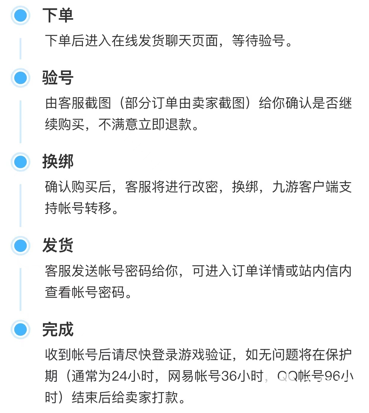 在买家拍下账号后,就可以直接进入到在线交易界面了,由官方客服进行流程的引导,就算是新手也能简单完成,之后就由客服上号截图与买家进行购买确认,不满意的还可以直接退款结束交易,确认购买后就可以换绑了,客服进行换绑与更改密码,收到账号之后还会有一段时间的保护期,无问题后在保护期结束时,平台就会给卖家打款了,所有交易完成,全程平台监管。